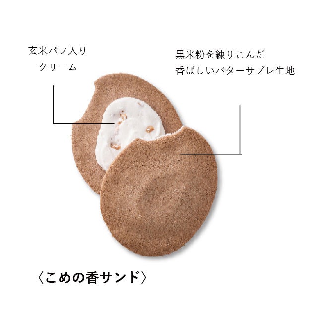 黒米粉をバターサブレ生地に練りこみ香ばしく焼き上げ、カリッと食感の玄米パフ入りのクリームを サンド。サクッと軽い食感のサブレ生地と優しい甘さのクリームをバランスよく組み合わせ、黒米の風味が楽しめるサンドに仕上げました。