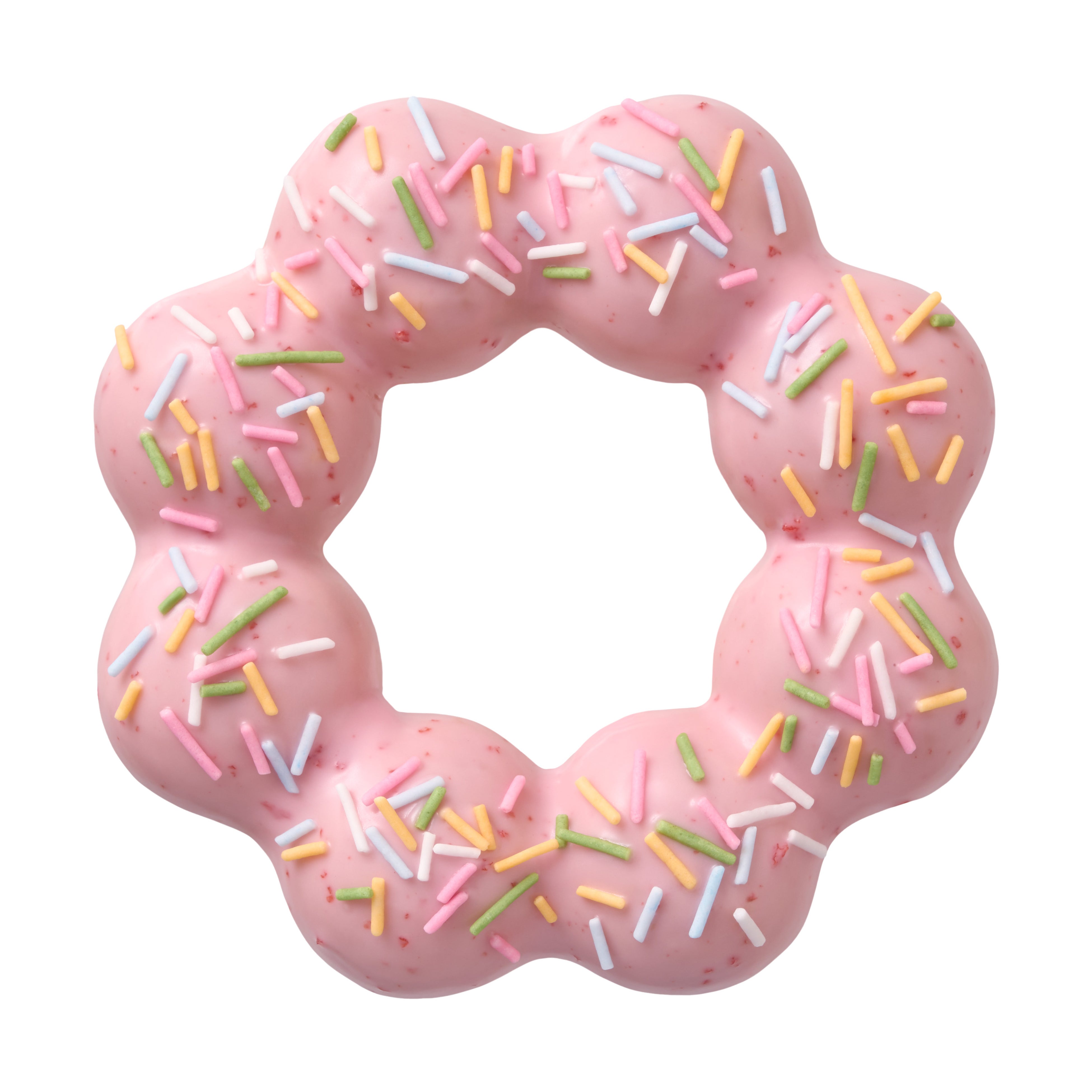 ポン・デ・リング生地にストロベリーチョコをコーティングして、カラーシュガーをトッピングしました。