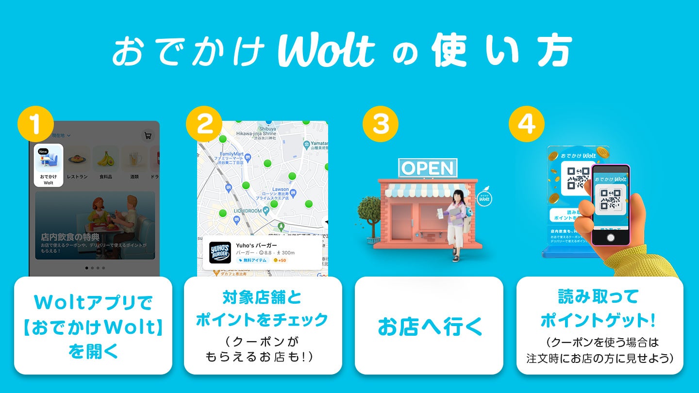※「おでかけWolt」の特典(クーポン・ポイント)は対象店舗限定です。特典の適用条件は各店舗の特典ページをご確認ください。「おでかけWolt」がWoltアプリ上でご覧になれない方は、Woltアプリを最新バージョンにアップデートした上で再度ご確認ください。