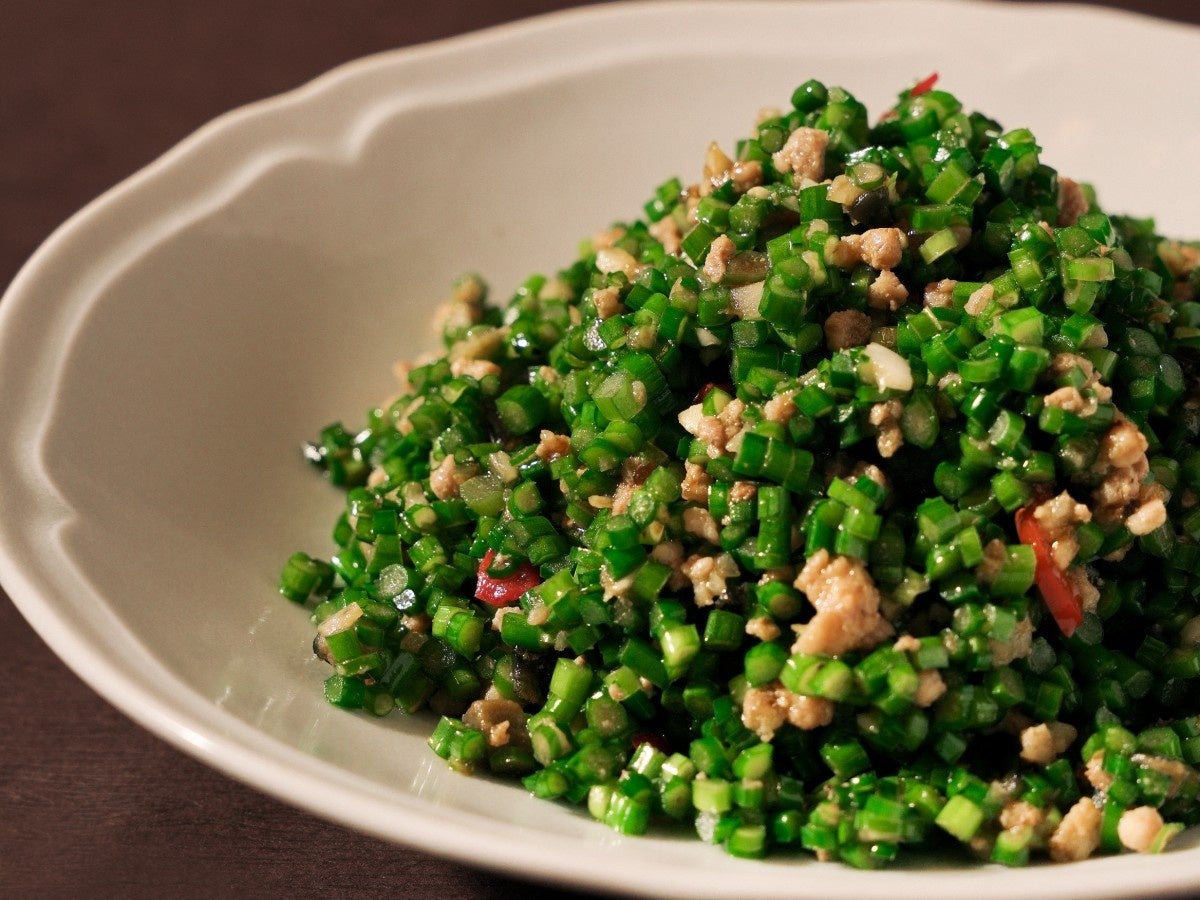 ・ 花ニラとピータン豚挽肉のピリ辛炒め