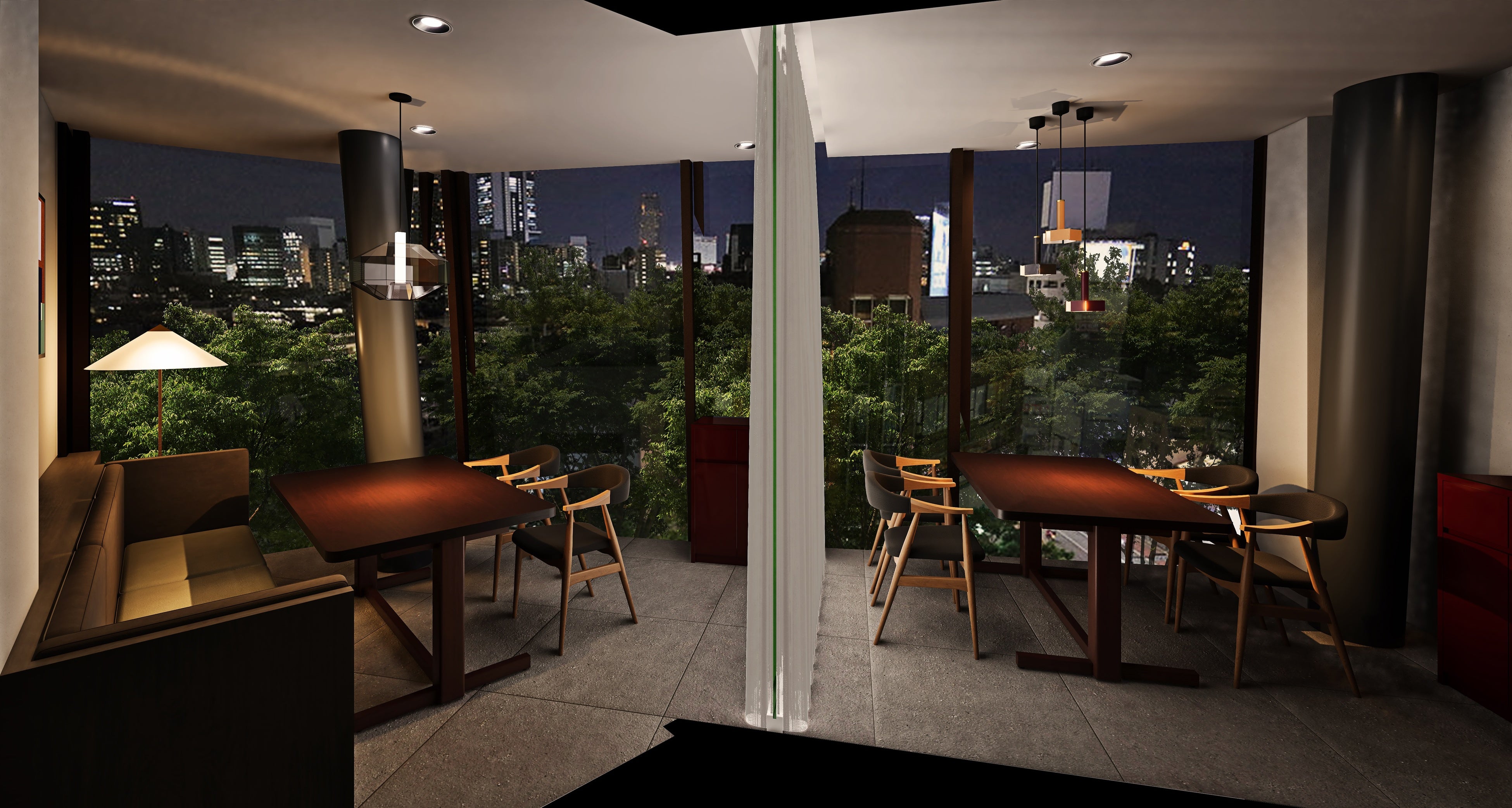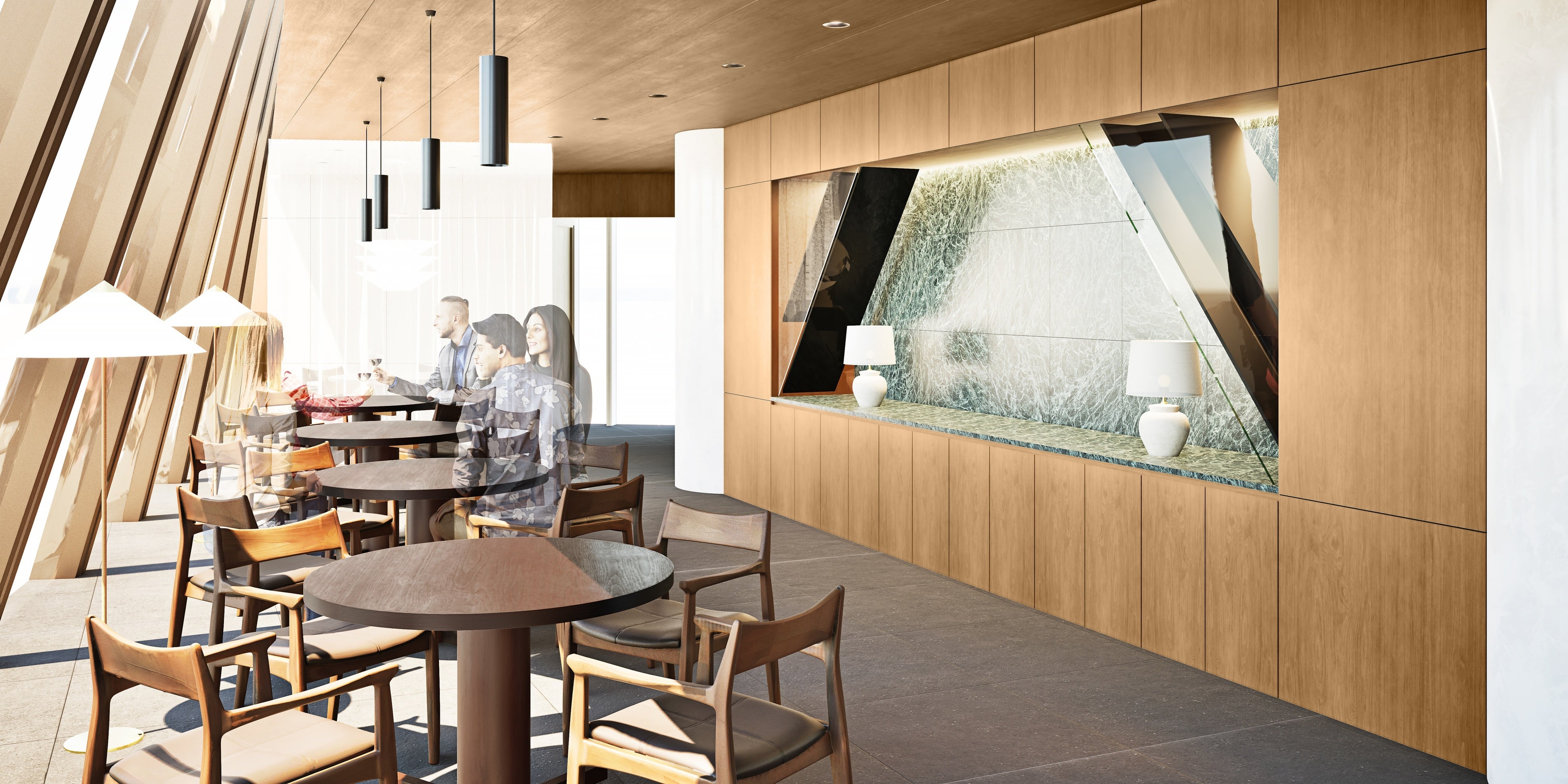 2面の窓から自然光が降り注ぐ、広がりと明るさを感じさせるメインダイニングにおいては、世界を舞台に活躍するアーティストによるアートを配置。ダイニング奥のエリアは、原宿クエストのデザインアーキテクトを務めた建築設計事務所「OMA」の代表・重松象平氏による傾斜したサッシとブレースや、台湾を彷彿とさせるグリーンの大理石の素材感を活かしたデザインとしています。窓際に配置された個室では、表参道を見下ろしながら特別な食事のひとときをお楽しみいただけます。