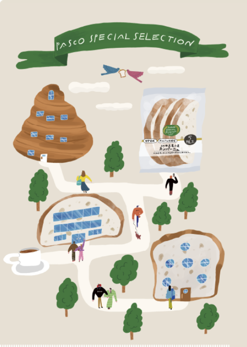 「PASCO SPECIAL SELECTION」を代表する「三角帽のクロワッサン 6個入」、「北海道産小麦 ライ麦つぶ入り食パン 3枚入」、「北海道産小麦 カンパーニュ 5枚入」を街の中の建物に見立てて、日常の暮らしを表現しました。細部にある、パンをイメージした小さな仕掛けもお楽しみいただけます。