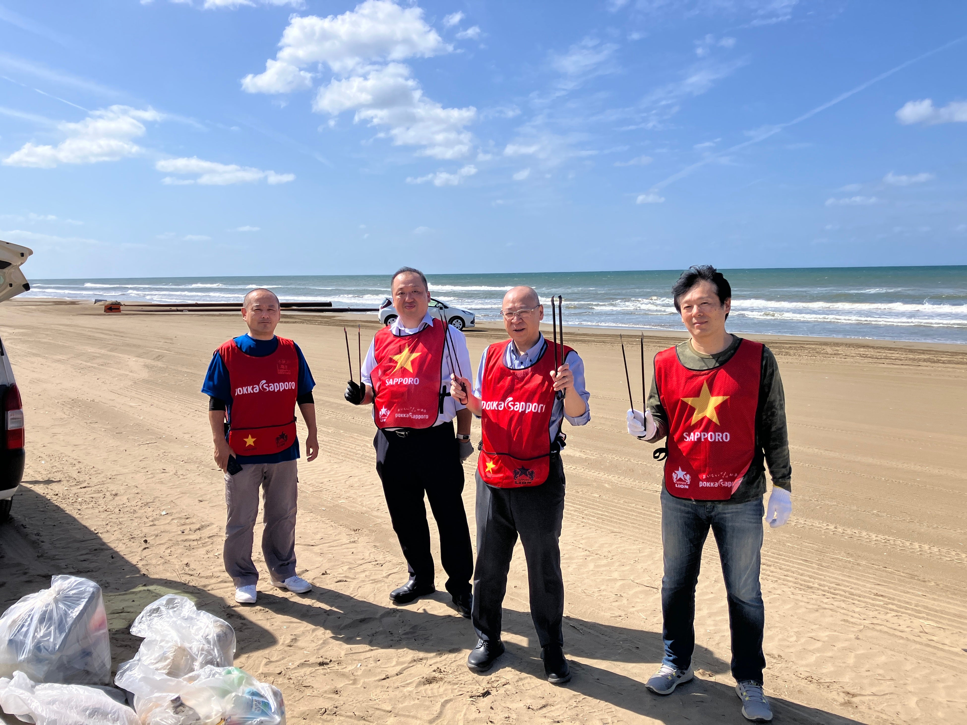 2021年より、「油谷製茶」が所在する石川県宝達志水町から羽咋市南部にかけての千里浜海岸を保全するための「千里浜再生プロジェクト」に賛同し、応援するため、協賛企業として参加しています。千里浜は全国で唯一、また世界でも珍しい「クルマで走れる砂浜(※2)」ですが、砂浜の侵食が激しく、年々砂浜が消失しています。千里浜海岸の保全に役立ててもらうため、本年も北陸エリアの売上の一部を「千里浜再生プロジェクト実行委員会」へ寄付しました。また本年は地域への貢献活動の一環として、10月6日に当社社員による千里浜なぎさドライブウェイでの清掃活動も行いました。
