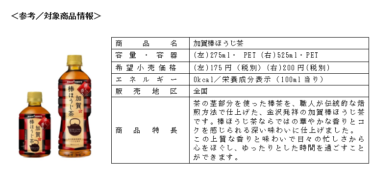 対象商品:「加賀棒ほうじ茶」(275mlPETボトル、525mlPETボトル)