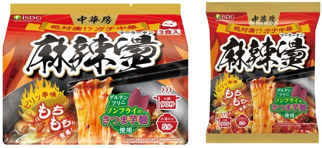 『中華房 麻辣燙(袋麺)』は、唐辛子、山椒、八角などのスパイスと旨味を凝縮した、本場仕様のビリッ辛味スープ×もちもち食感のさつま芋麺(※2)。好きな具材(※3)を追加して味わえる袋麺タイプ。