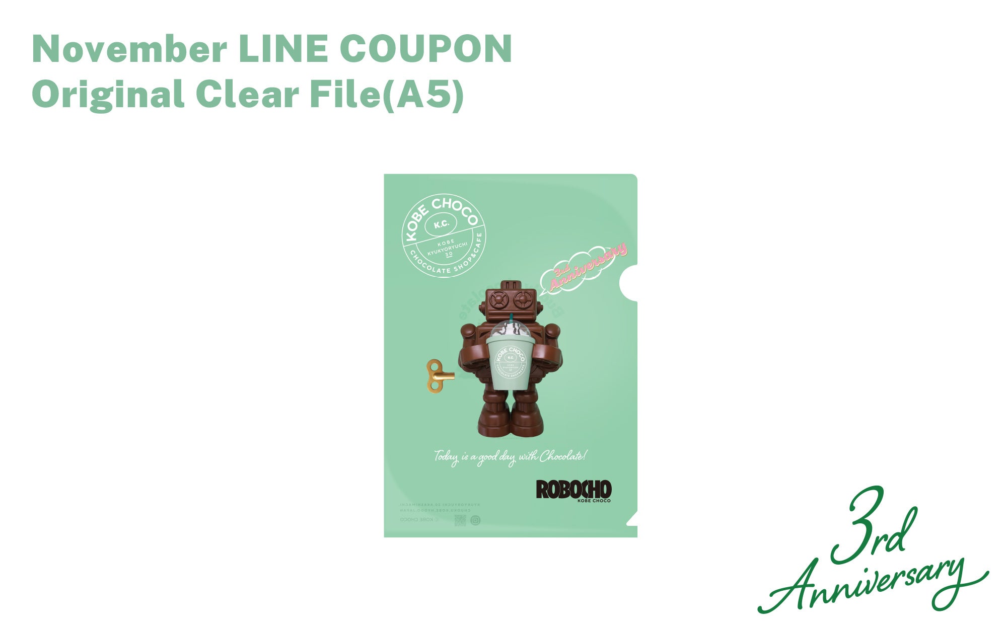 11月限定のLINEクーポン(KOBE CHOCO LINE会員特典)にてショップ又はカフェのご利用で3rdアニバーサリー限定のオリジナルクリアーファイル(A5サイズ)をもれなくプレゼント。