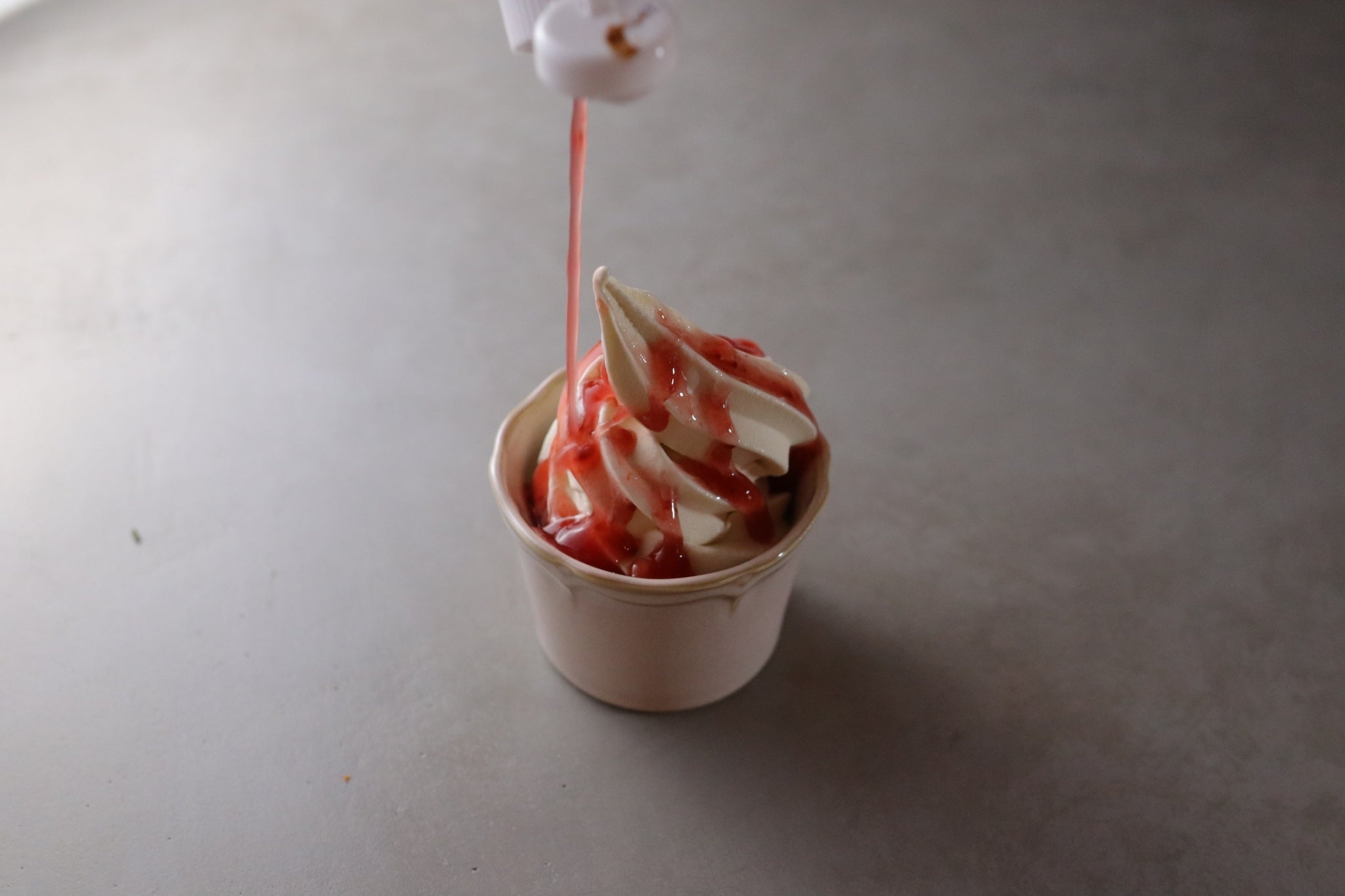 本格ソフトクリームにはお好きなソースをかけて自分だけのパフェが完成します。お子様が楽しめる空間になっております。