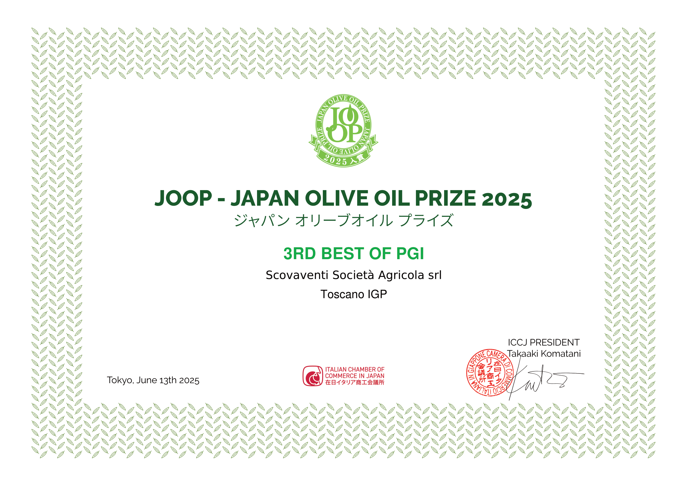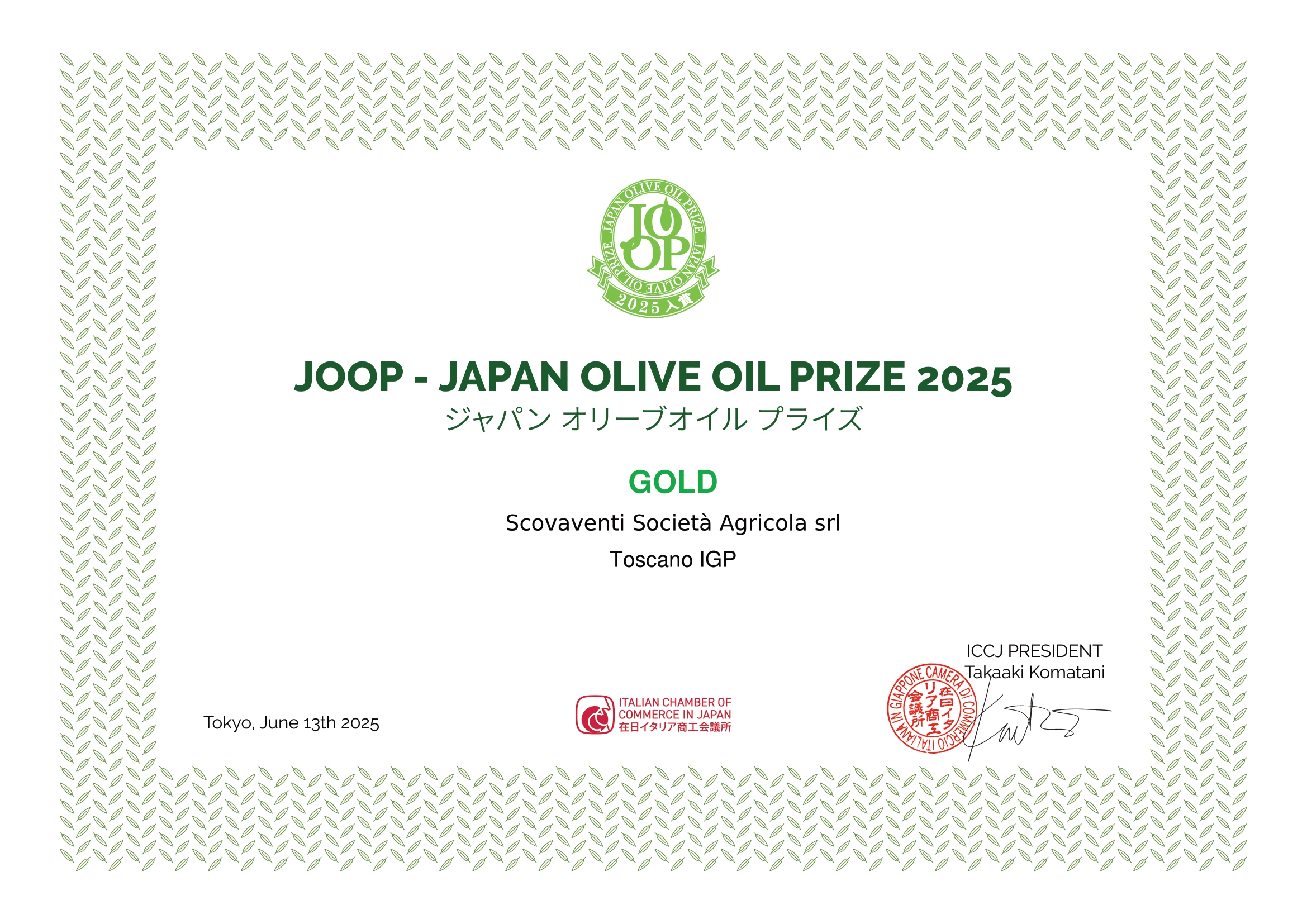 JOOPは、日本で開催されている国際オリーブオイルコンテストであり、世界を代表するプロフェッショナルなオリーブオイルテイスター11名による公平かつ透明性のある審査が行われます。2025年は、主要生産地28か国から578点のエントリーがありました。評点は、75点(最低)から100点(最高)のポイント制で、オーガニック、ブレンド、単一品種、P.D.O.、P.G.I.、フレーバーなどのカテゴリーで分類されます。「トスカーノ IGP」は金賞を受賞した他、P.G.I.部門でも3位の「3rd Best of PGI」を受賞しました。