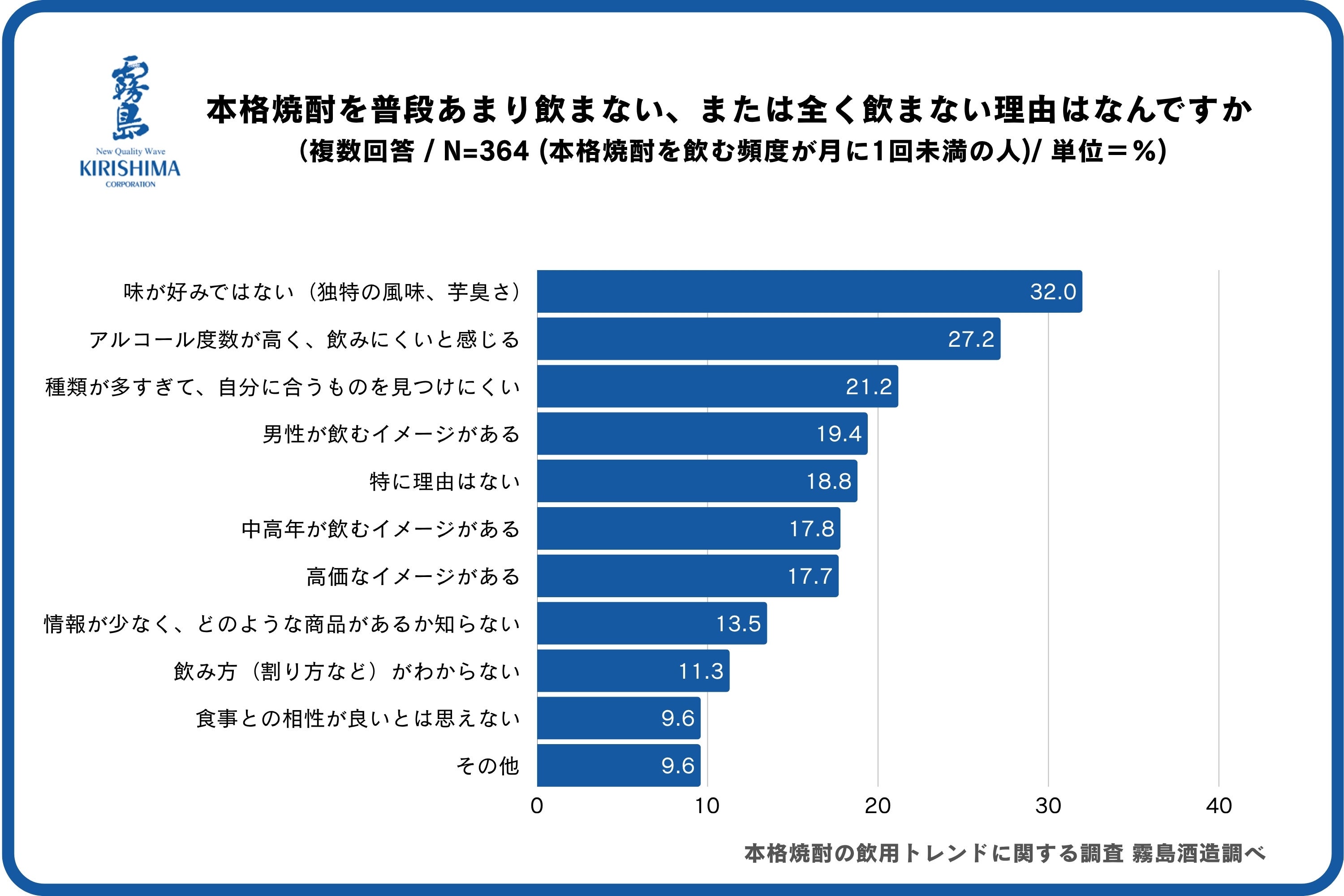 本格焼酎を飲む頻度が月に1回未満の方に本格焼酎を飲まない理由を質問したところ、1位「味が好みではない(独特の風味、芋臭さ)」(32.0%) 、2位「アルコール度数が高く、飲みにくいと感じる」(27.2%)、3位「種類が多すぎて、自分に合うものを見つけにくい」(21.2%)という結果になりました。