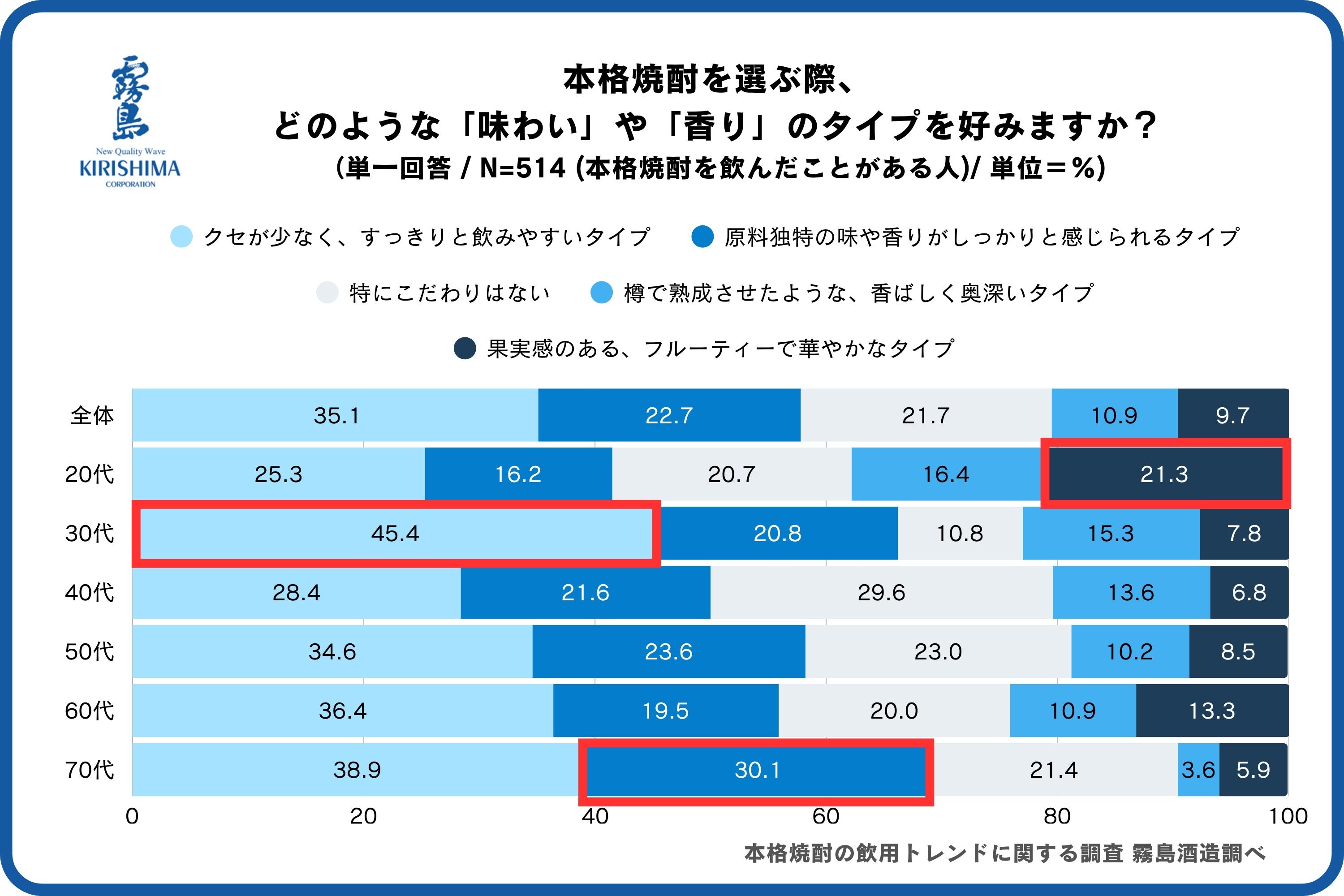 また、「原料独特の味や香りがしっかりと感じられるタイプ」を選んだ割合は70代が最多(30.1%)となっている一方で、「果実感のある、フルーティーで華やかなタイプ」を選んだ割合は20代(21.3%)で他の世代より高い傾向が見られるなど、新たな味わいのニーズがあることも判明しました。