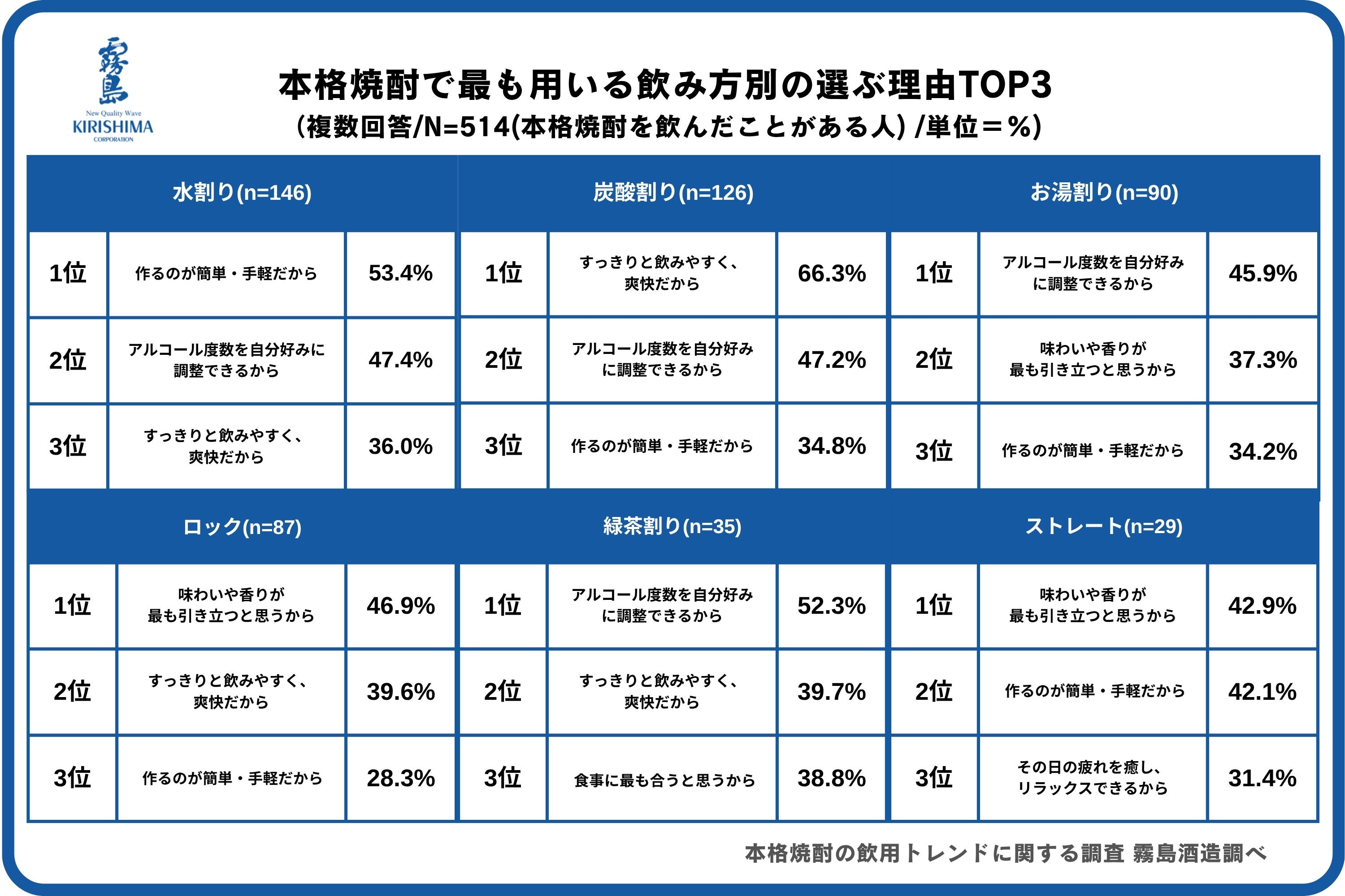 また、2位の理由「アルコール度数が高く、飲みにくいと感じる」に対しても、本格焼酎を飲んでいる層が飲み方を選ぶ理由として「アルコール度数を自分好みに調整できるから」と挙げている点や、炭酸割りなどの飲み方が広がっている点からも、時代に合った多様な焼酎の楽しみ方が伝わりきっていない現状が明らかになりました。