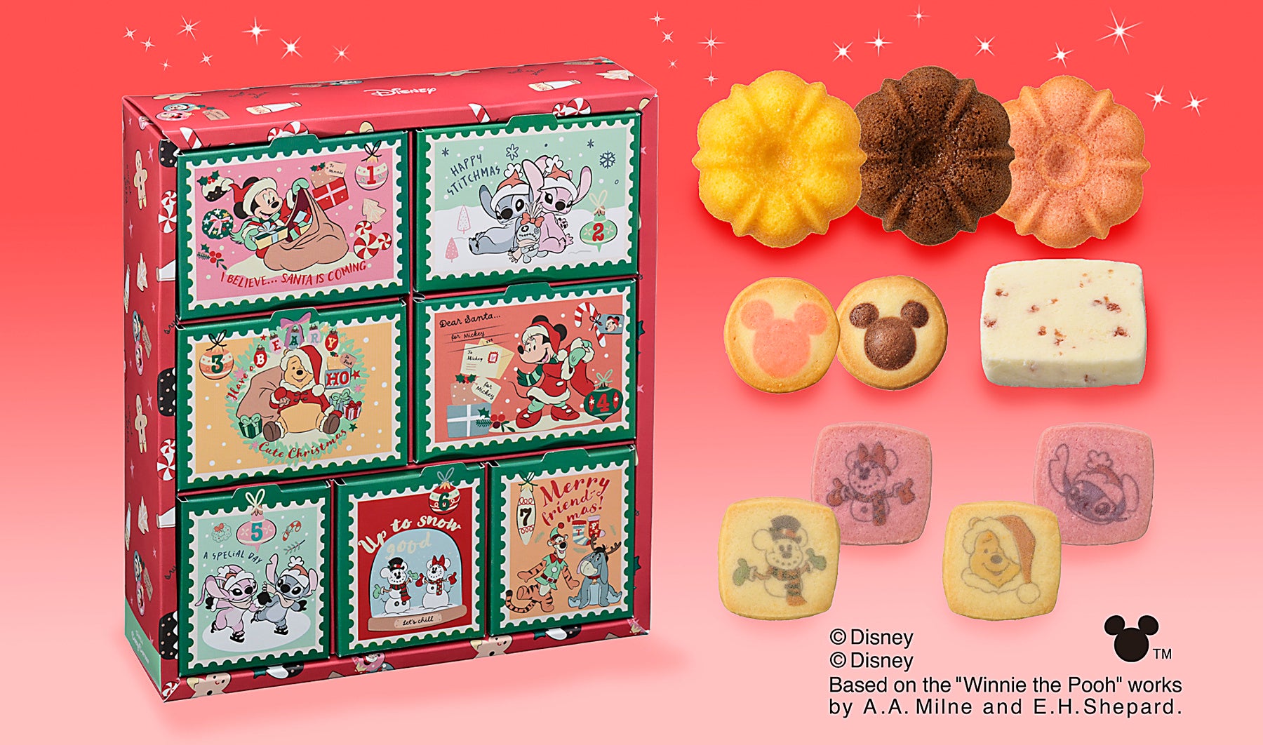 「ミッキーマウス」や「ミニーマウス」、『リロ&スティッチ』『くまのプーさん』に登場するキャラクターたちと数字の書かれた扉を開くと、マドレーヌやクッキー、焼きショコラが!