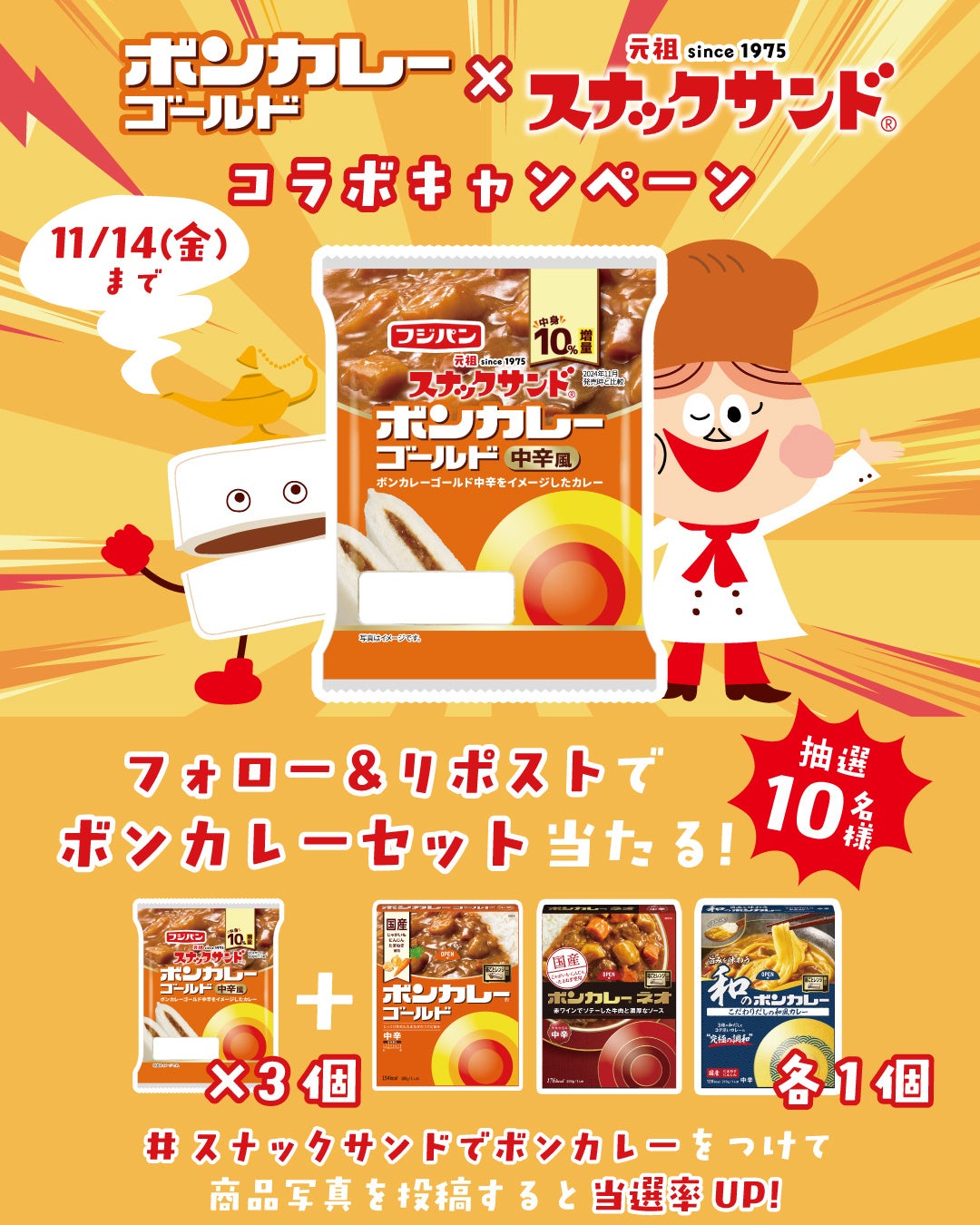 フジパン公式 X アカウント( https://x.com/neobata_f ujipan )では、フォロー&リポストで参加できる「ボンカレー ゴールド×スナックサンドコラボキャンペーン 」を実施いたします。