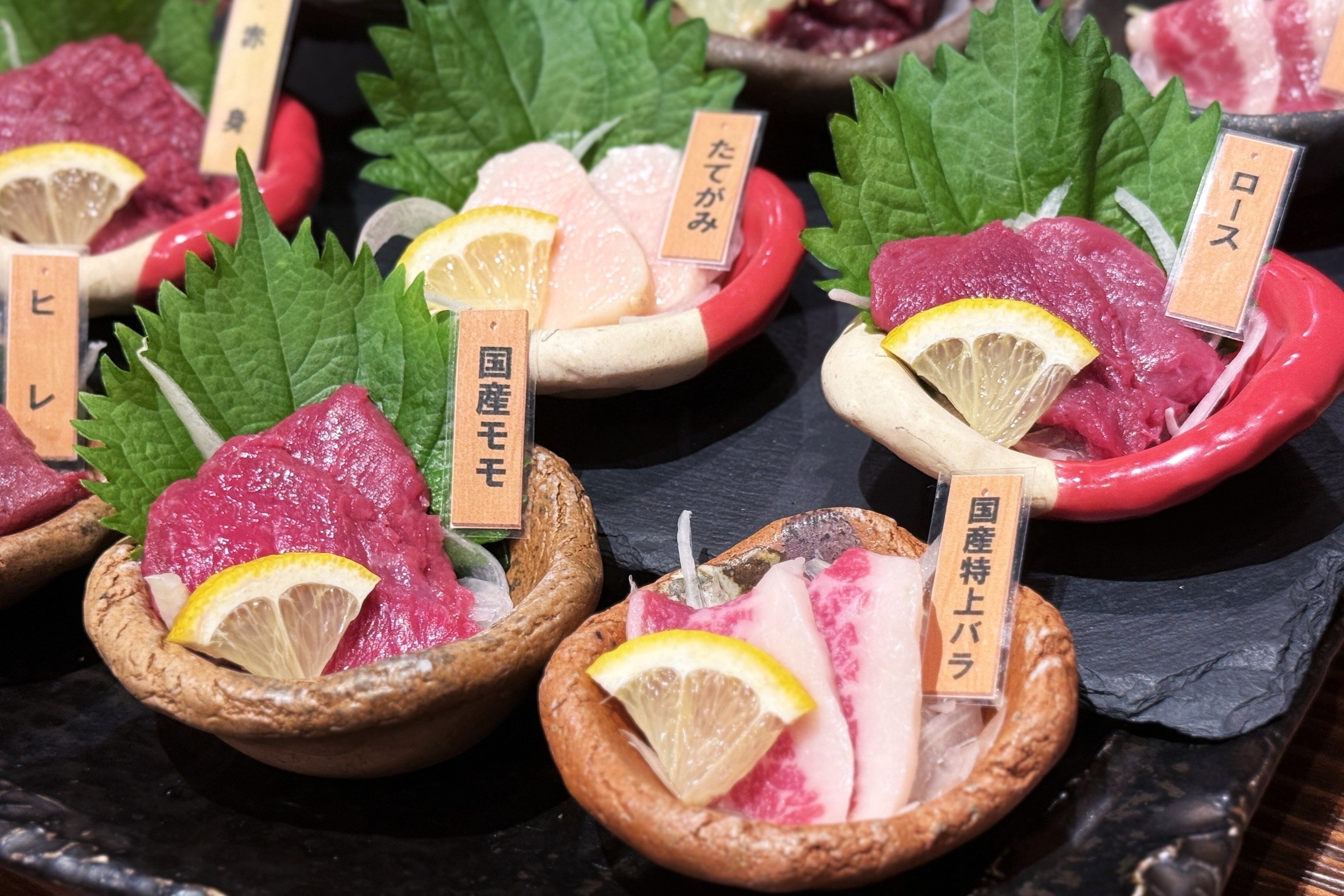 さらに、盛り合わせの中には必ず2種類の“純国産馬刺し”を使用。品質にこだわり抜いた新鮮な馬肉だけを厳選しています。艶やかな赤身の色合いと美しい盛り付けは、テーブルに並べるだけで思わず写真を撮りたくなる華やかさです。
