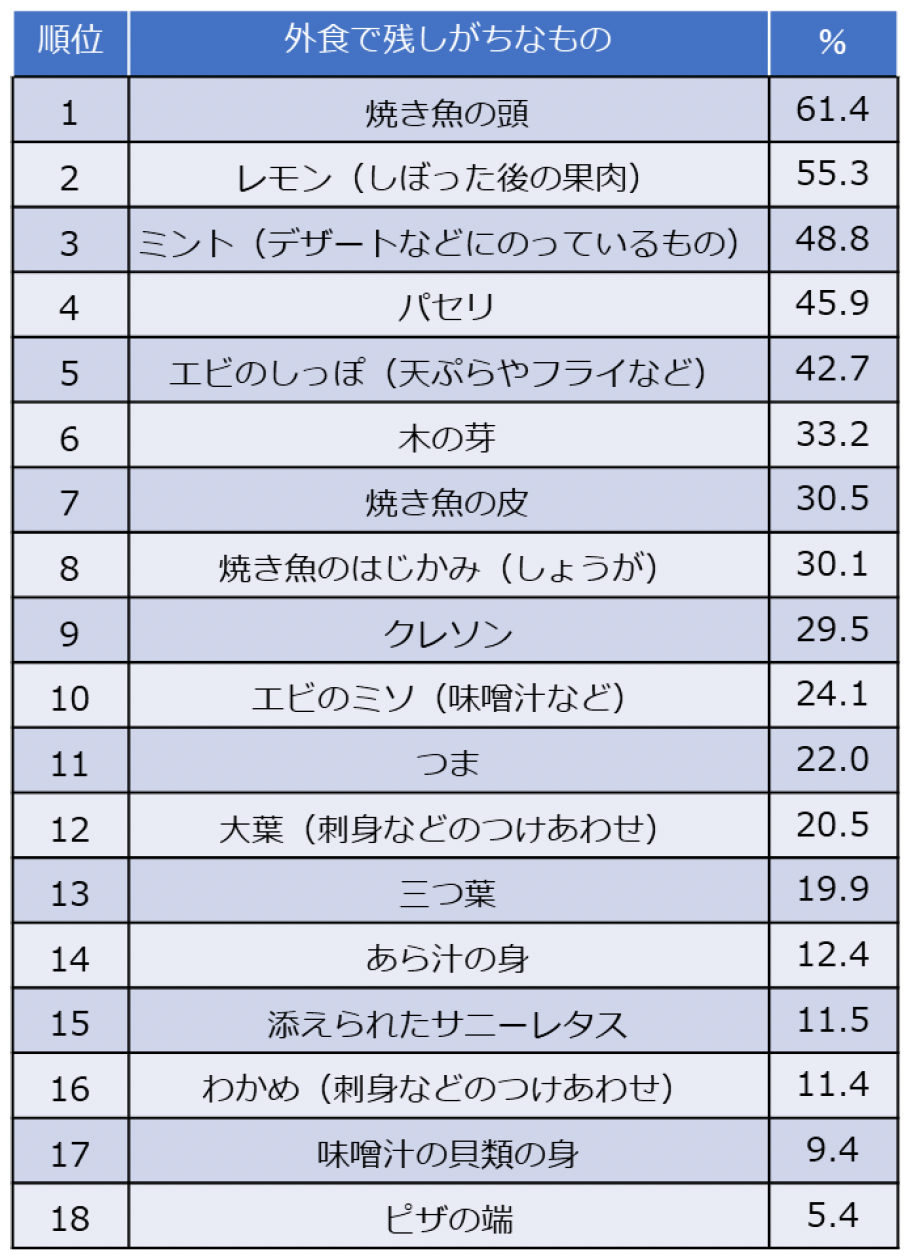 ホットペッパーグルメ外食総研が挙げた「外食で残しがちなもの」18個の項目のうち、「味が苦手」「食べられるものだと思っていない」などの理由で「食べない」の回答が多かったものをまとめると、1位は「焼き魚の頭」で61.4%でした。2位以下には「レモン(しぼった後の果肉)」(55.3%)、「ミント(デザートなどにのっているもの)」(48.8%)、「パセリ」(45.9%)、「エビのしっぽ(天ぷらやフライなど)」(42.7%)が続きました。一方、「食べない」の回答が最も少なかったのは「ピザの端」(5.4%)で、「味噌汁の貝類の身」(9.4%)、「わかめ(刺身などのつけあわせ)」(11.4%)が続きました。