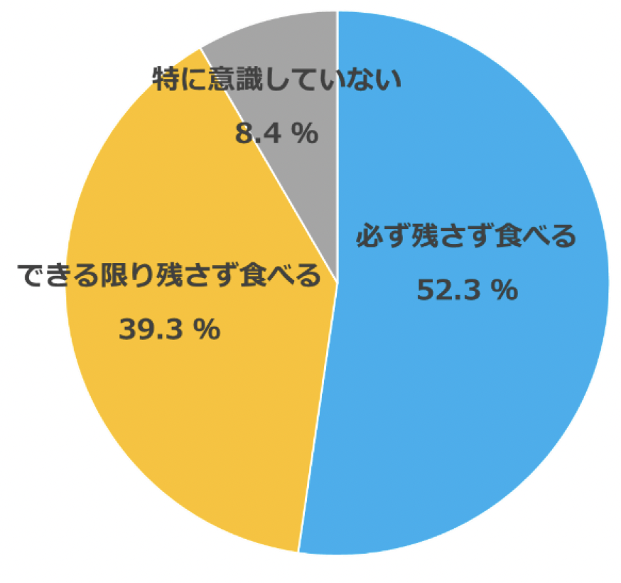 「あなたは外食をする際、できるだけ食べ残しをしないように意識していますか?」という質問では、「必ず残さず食べる」が最も多く52.3%、「できる限り残さず食べる」が39.3%で続き、「特に意識していない」は8.4%でした。