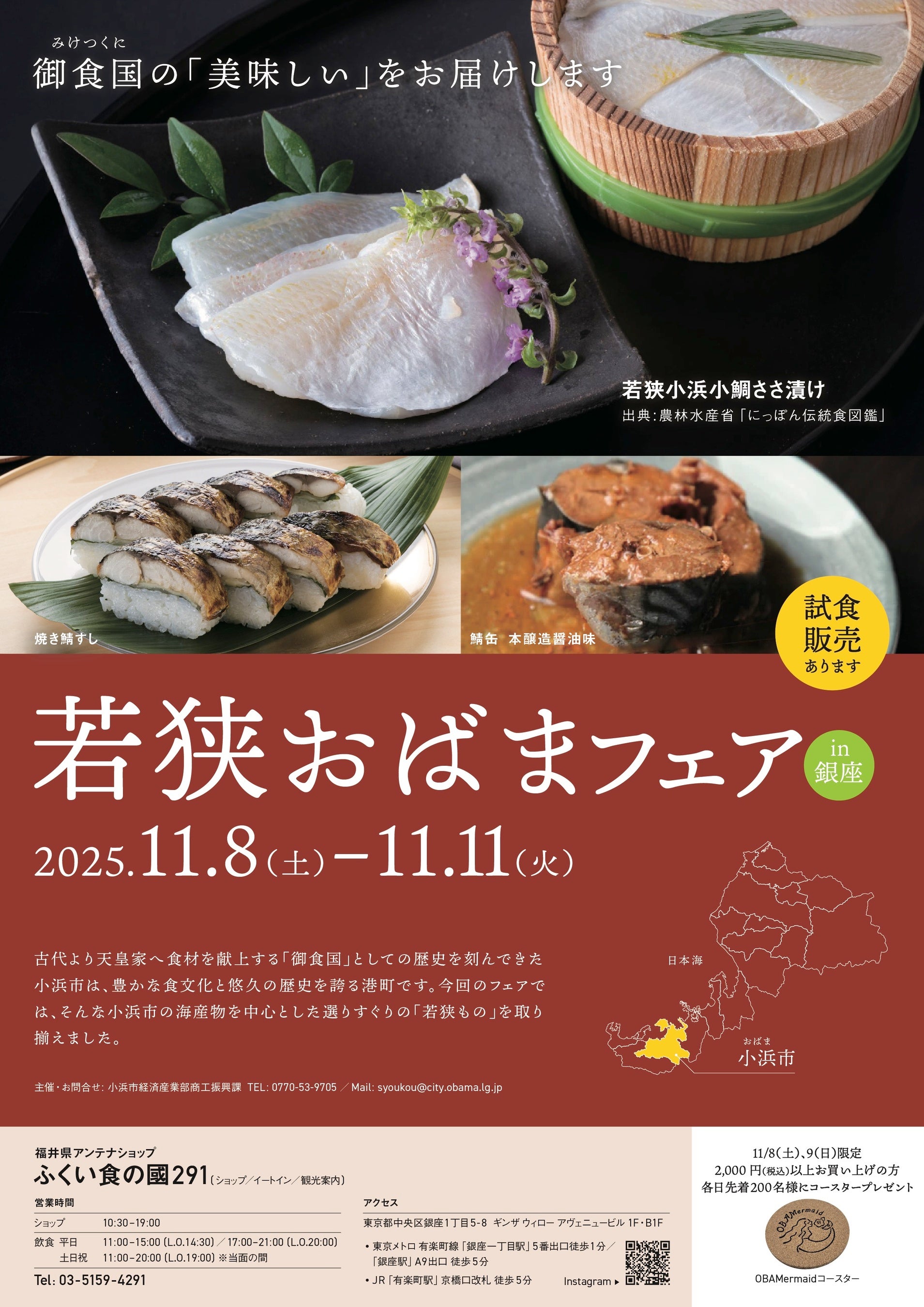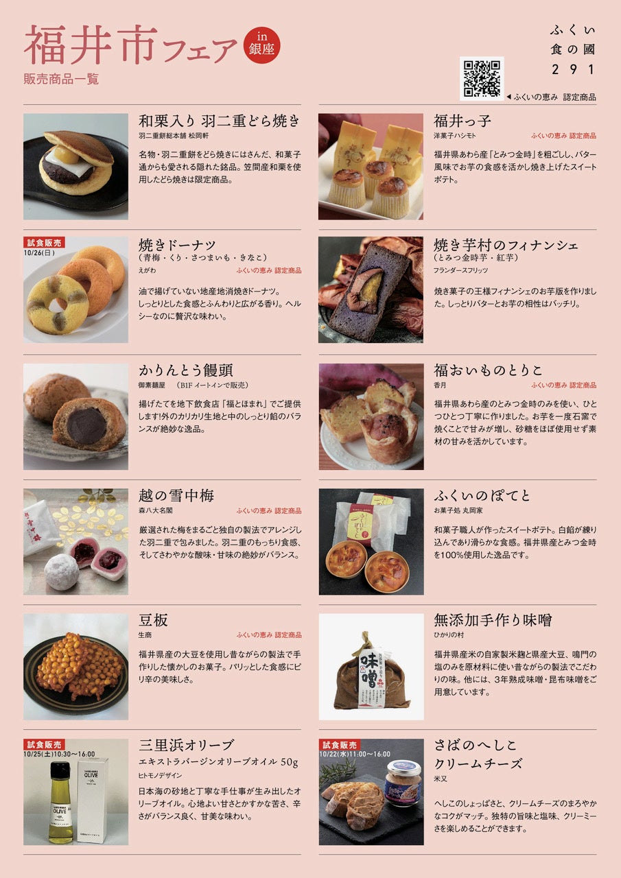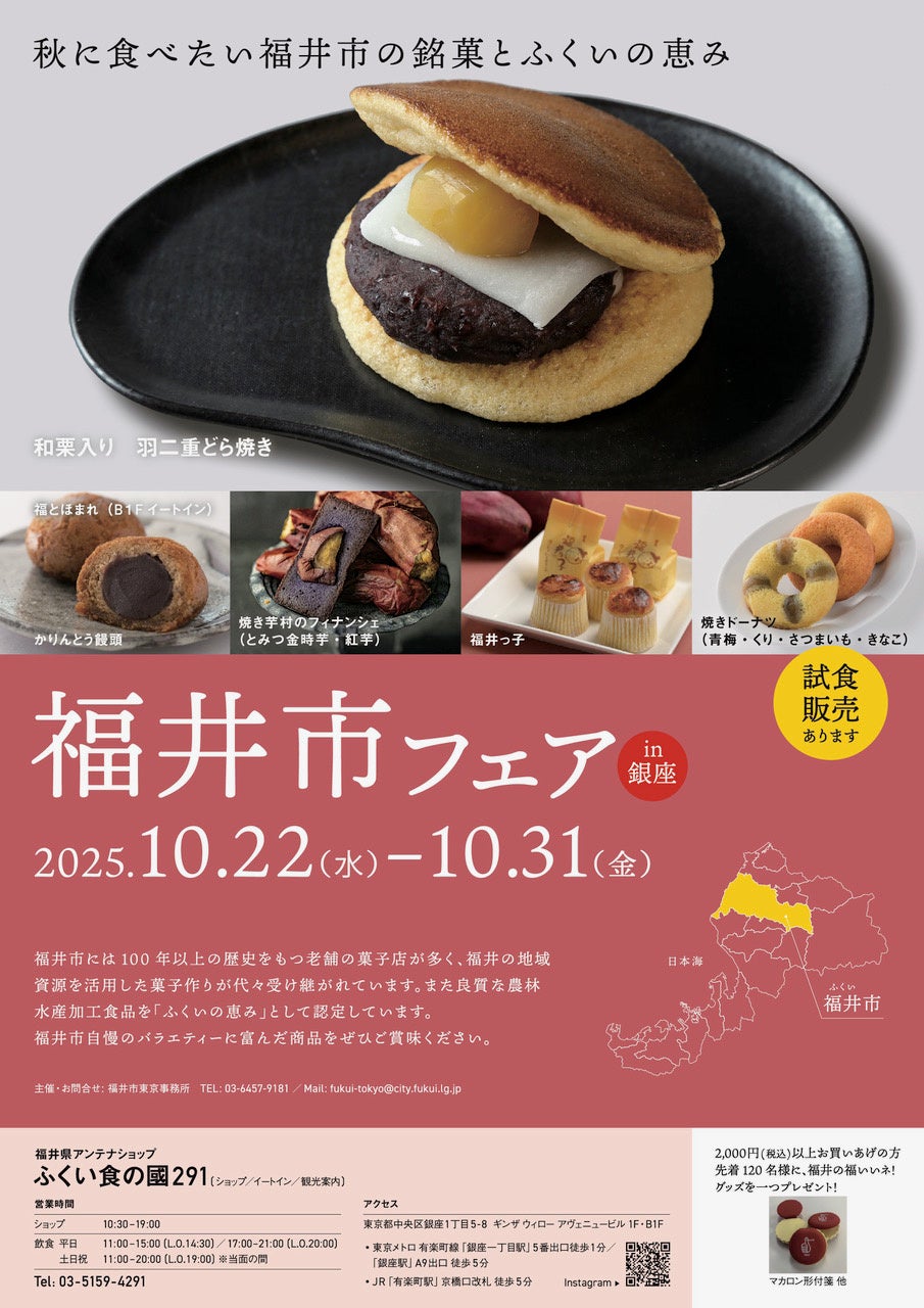 オウデム株式会社(福井県福井市・代表取締役 佐々木祐貴)は福井県内の企業4社と共に 2022 年4月からコンソーシアム「ALL FUKUI」を運営しています。ALL FUKUI が共同運営する食とビジネスの交流拠点、福井のアンテナショップ「ふくい食の國 291」(銀座)において、2025 年 10 月 22 日(水)から 10 月 31 日(金)までの 10 日間、福井市にゆかりのある特産品を集めた「福井市フェア」を開催しています。