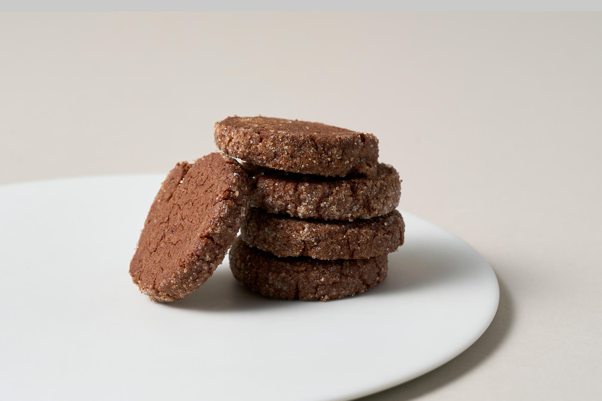 バタークッキーに、ガーナ産カカオのハイカカオチョコレートを上がけしました。ガーナ産のカカオは、王道のチョコレートらしいボディ感とほのかなスパイス香が特徴です。クッキー生地には粒が大きめの砂糖を使ってザクザク食感に仕上げ、チョコレートは細挽きで滑らかにすることで、食べたときのまとまりが良くなるように調整しました。