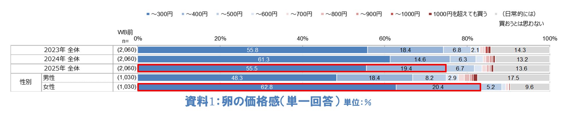 長年にわたり、卵は「物価の優等生」とされてきましたが、近年、飼料の高騰や鳥インフルエンザの発生による供給不安と価格高騰に直面しました。今回の調査では、卵(10個パック)に支払える金額は、300円までが前年から5.8ポイント減少した一方で、400円までが前年から4.8ポイント増加しました。この意識の変化は、食料品全般の価格高騰が続く中で、卵は価値のある食材であると認識されていると推察します。
