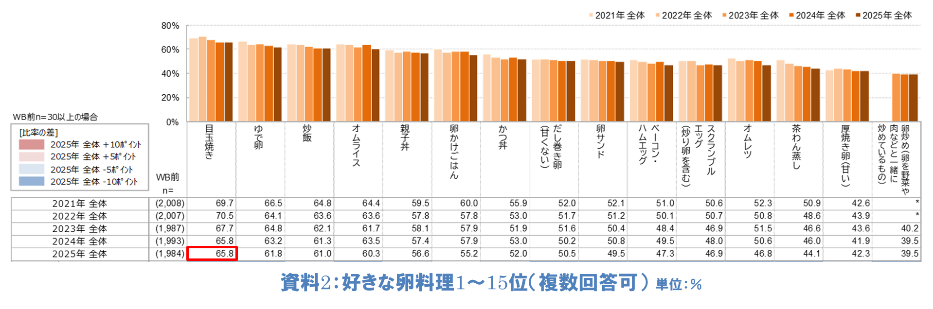 卵を使った料理に関する調査において、好きな卵料理の1位は「目玉焼き」で65.8%、次いで「ゆで卵」61.8%でした(資料2)。