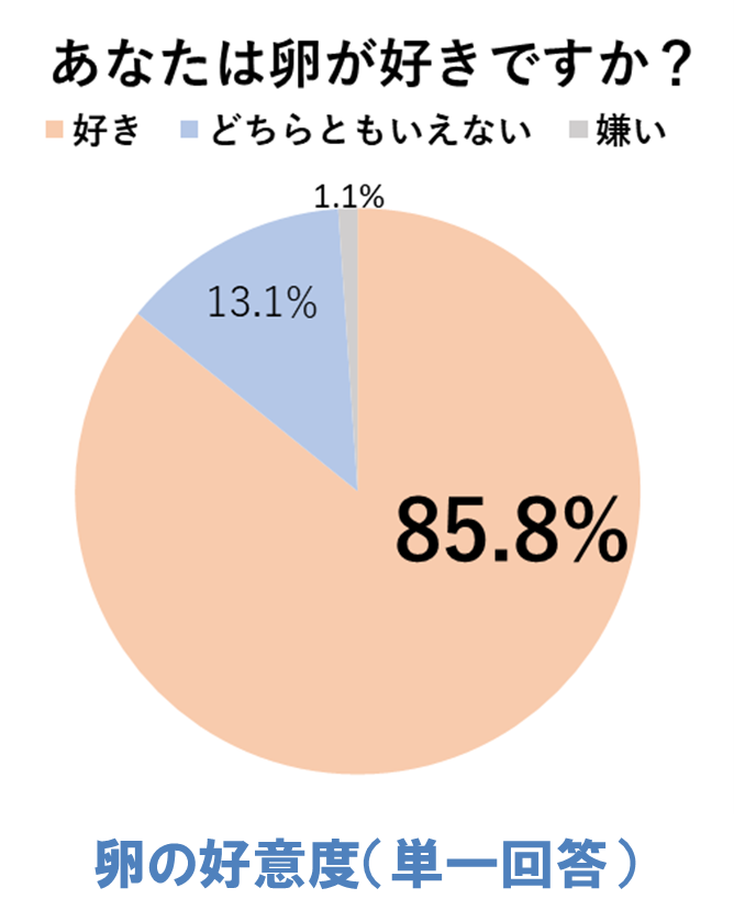 今年の調査では、卵に対する好意度が全体の85.8%(「とても好き」50.0%、「やや好き」35.8%の合計)に達し、前年と同様に高い水準を維持していることが分かりました。特に「とても好き」と回答した割合は前年から2.3ポイント増加しています。卵は依然として日本人に愛され続ける食材であることが分かりました。