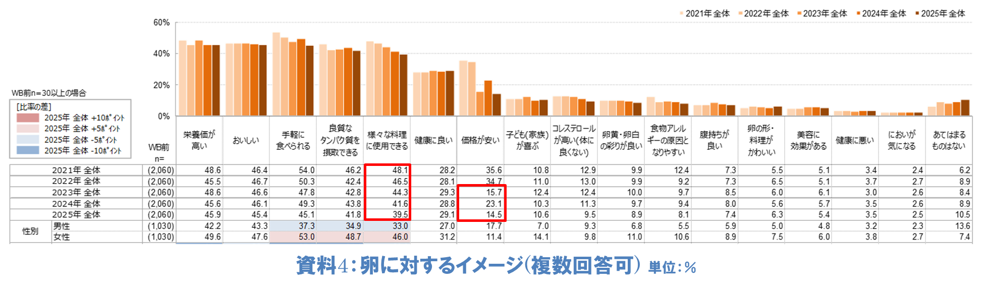 飼料代の高騰や鳥インフルエンザの流行による価格変動が続く中、卵の価格に対する意識は変化しています。卵(10個パック)の日常的な購入価格として「300円まで支払える」と回答した人は全体の55.5%で、前年に比べ5.8ポイント減少しましたが、「400円まで」と回答した人は19.4%で、前年に比べ4.8ポイント増加しています。女性全体では、「300円まで」と「400円まで」を合わせると83.2%と8割以上に上り、この価格意識の変化は、卵の主要なイメージであった「価格が安い」という認識が前年から低下していることと連動していると考えます(資料1)。