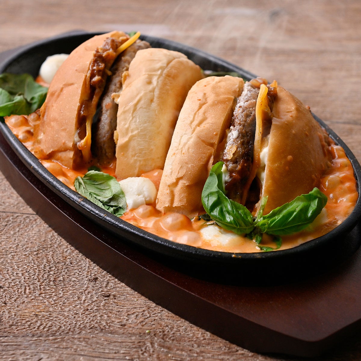 鉄板でとろける、とろ~り“チーズの海”に、肉×バジル×トマトがスマッシュダイブ!