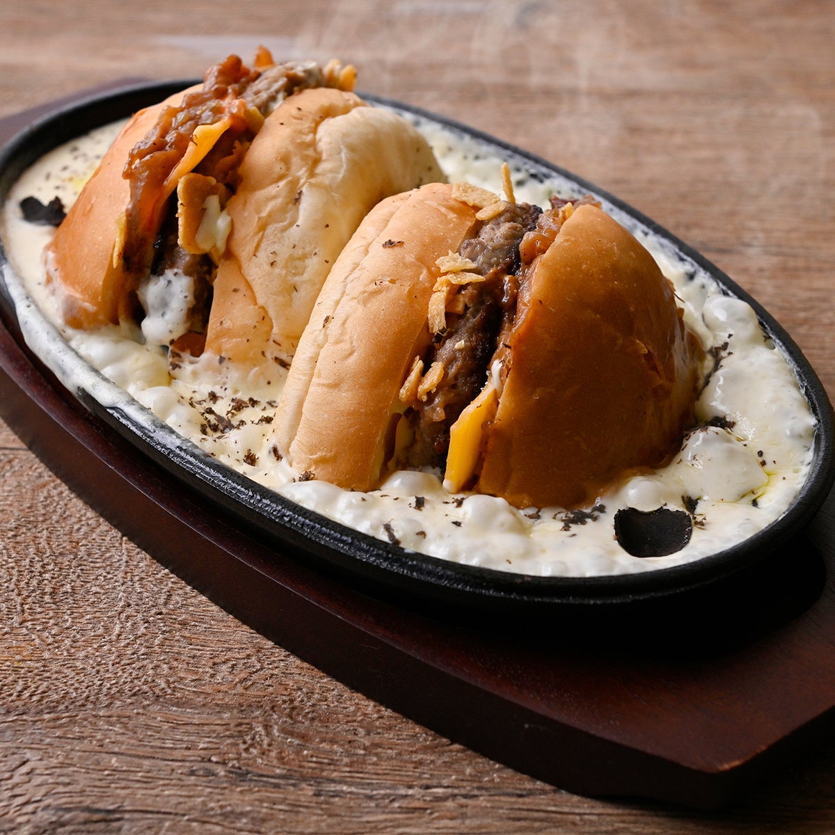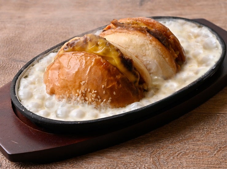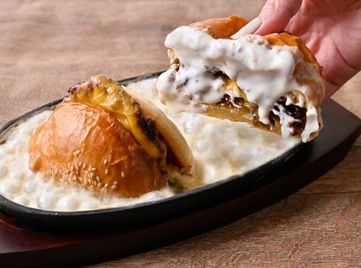 パティを強く押し潰して焼き上げる“スマッシュ製法”で、カリッとした表面とジューシーな肉汁を閉じ込めた絶品バーガー!さらに、完成したバーガーを半分にカットし、その断面をとろ~り濃厚チーズを豪快に流し込んだ熱々の鉄板で“2度焼き”!肉の旨みと焦がしチーズの香ばしさが絡み合う、
