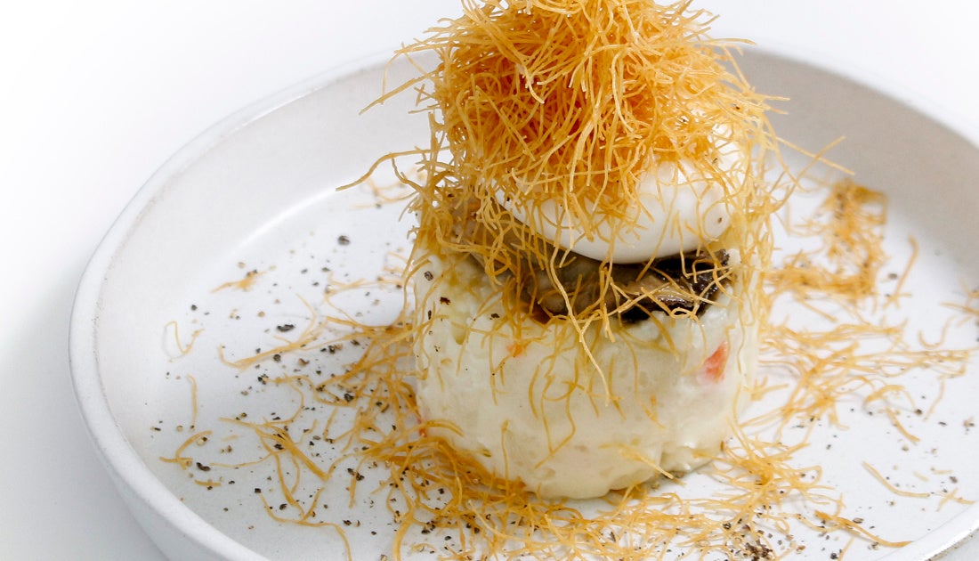 北海道十勝産じゃがいもと燻製チーズが出会うスモーキーな香りのポテトサラダに、牡蠣醤油でさっと煮た牡蠣を合わせました。