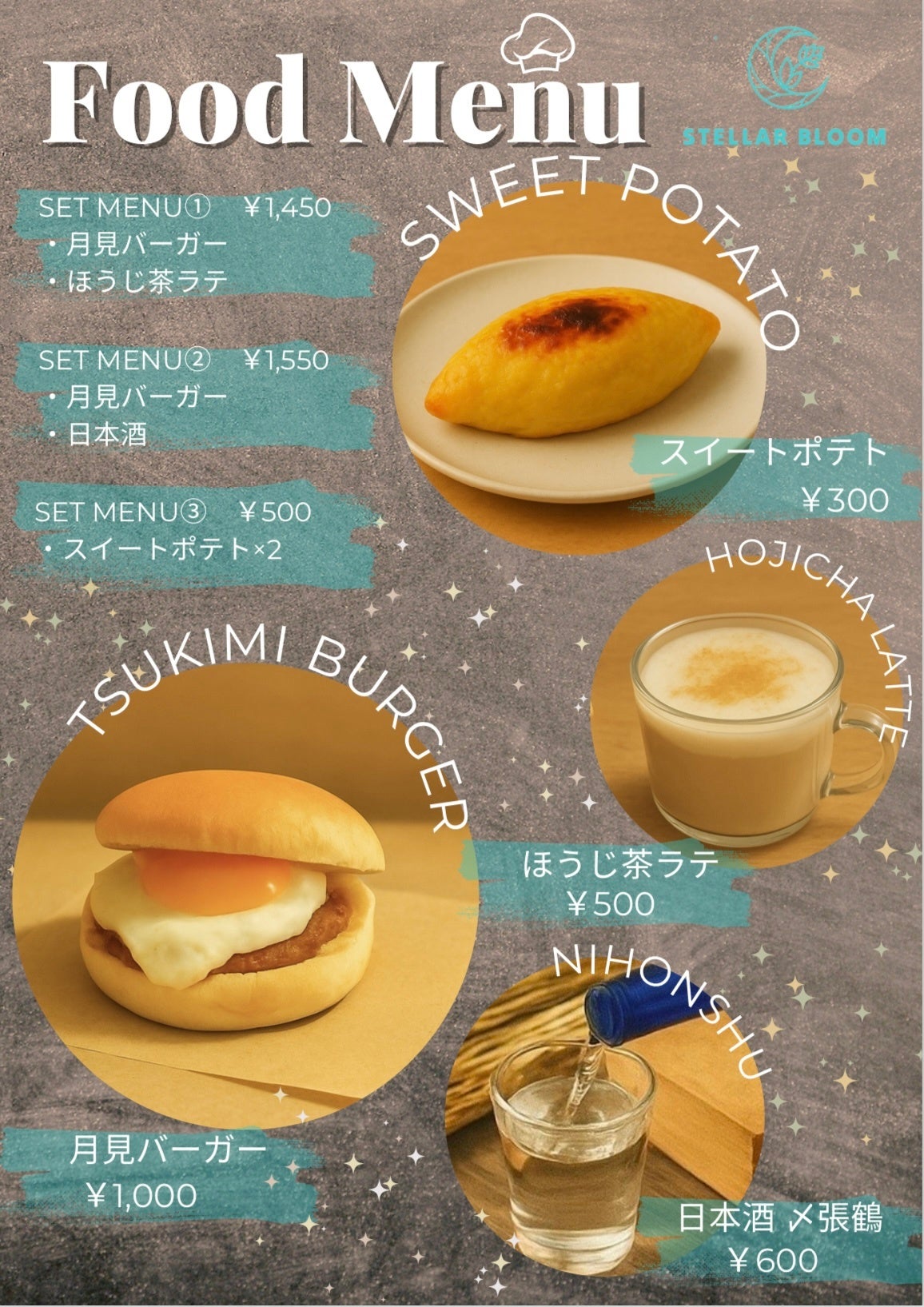 今回はイベントやワークショップ、お買い物を楽しみながらでも秋の味覚を食べやすいように、バンズとパテにこだわった絶品月見バーガーと、パティシエ監修の自家製スイートポテト、ほっこり落ち着けるほうじ茶ラテ、バーガー・スイートポテトと相性抜群の銘酒〆張鶴をご提供しました。