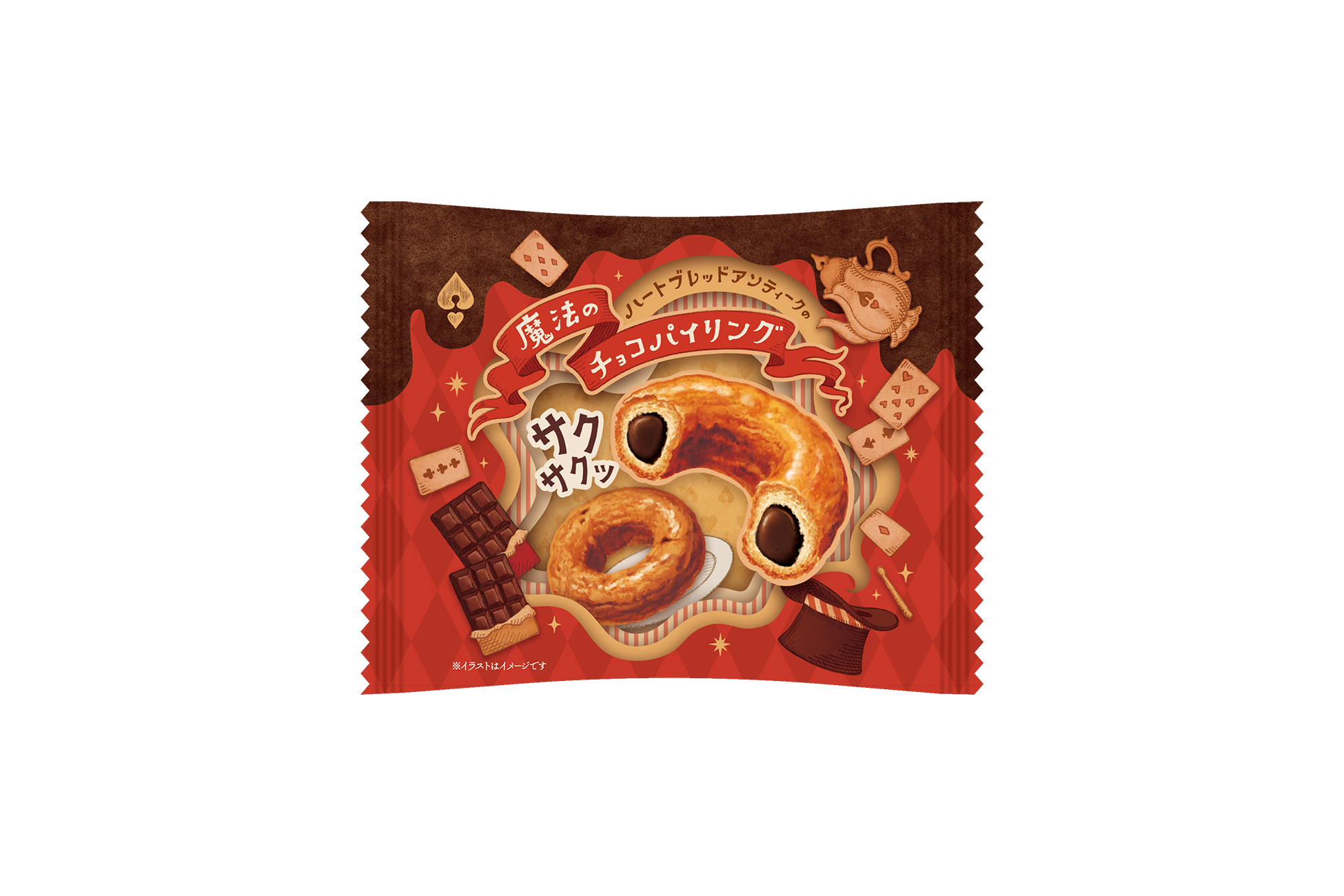看板商品「マジカルチョコリング」をイメージした色合いをベースに、トランプや浮いているティーポットなど、「ハートブレッドアンティーク」のワクワク感やマジカルな世界観を感じるようなデザインに仕上げました。おやつや手土産にもぴったりな個包装タイプでお届けいたします。