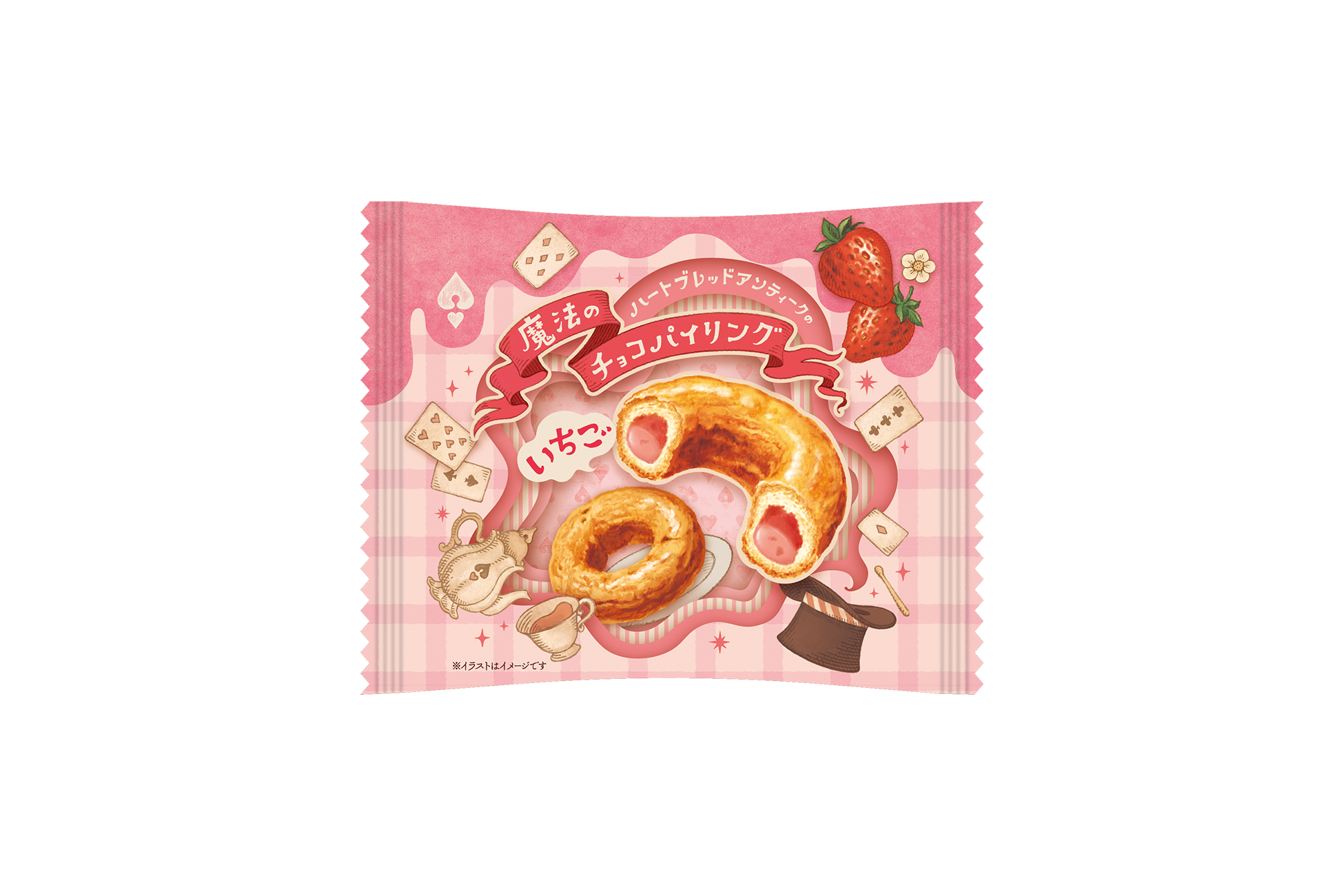 甘酸っぱいいちごをイメージした色合いをベースに、トランプや浮いているティーポットなど、「ハートブレッドアンティーク」のワクワク感やマジカルな世界観を感じるようなデザインに仕上げました。おやつや手土産にもぴったりな個包装タイプでお届けいたします。
