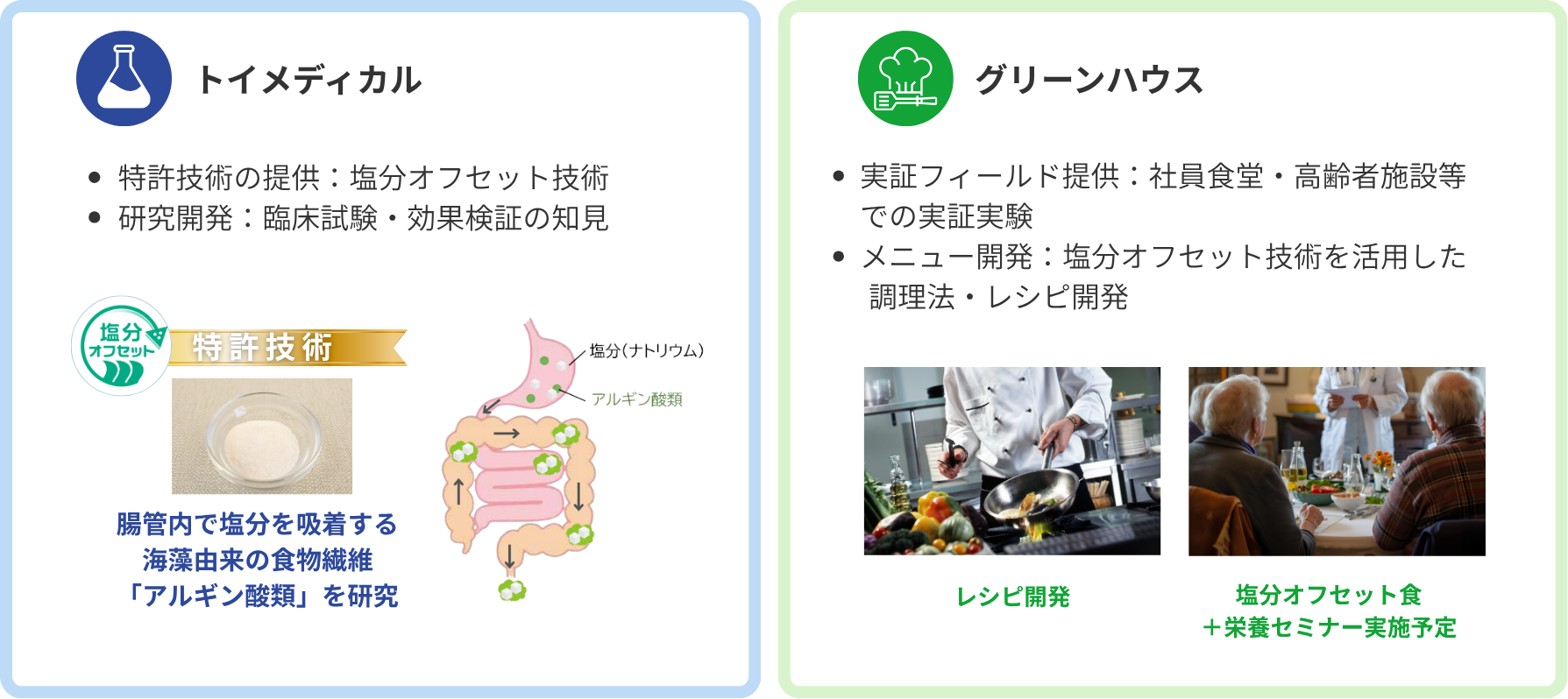 グリーンハウスは、味を変えずに塩分の体内吸収をコントロールする独自技術を持つトイメディカルと連携し、「塩分オフセットメニュー」という新たな食品カテゴリの共創に取り組みます。当社の調理ノウハウや多様なタッチポイントを生かし、食事の味や満足感を損なうことなく、より健康的な食生活を実現する新たな食環境の創出を目指します。本取り組みを通じて、生活者の健康意識の向上を促進するとともに、健康寿命の延伸や未病対策への貢献を図ります。さらに、生活習慣病の予防による医療費の抑制といった社会的価値の創出にも寄与してまいります。