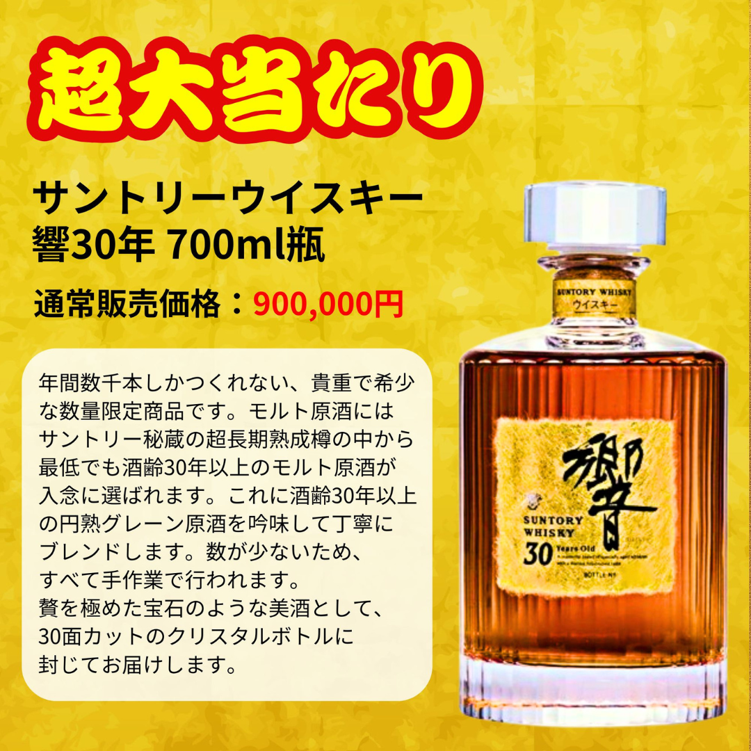 ・超大当たりには、サントリーが誇るブレンデッドウイスキーの最高峰「響30年」を設定。