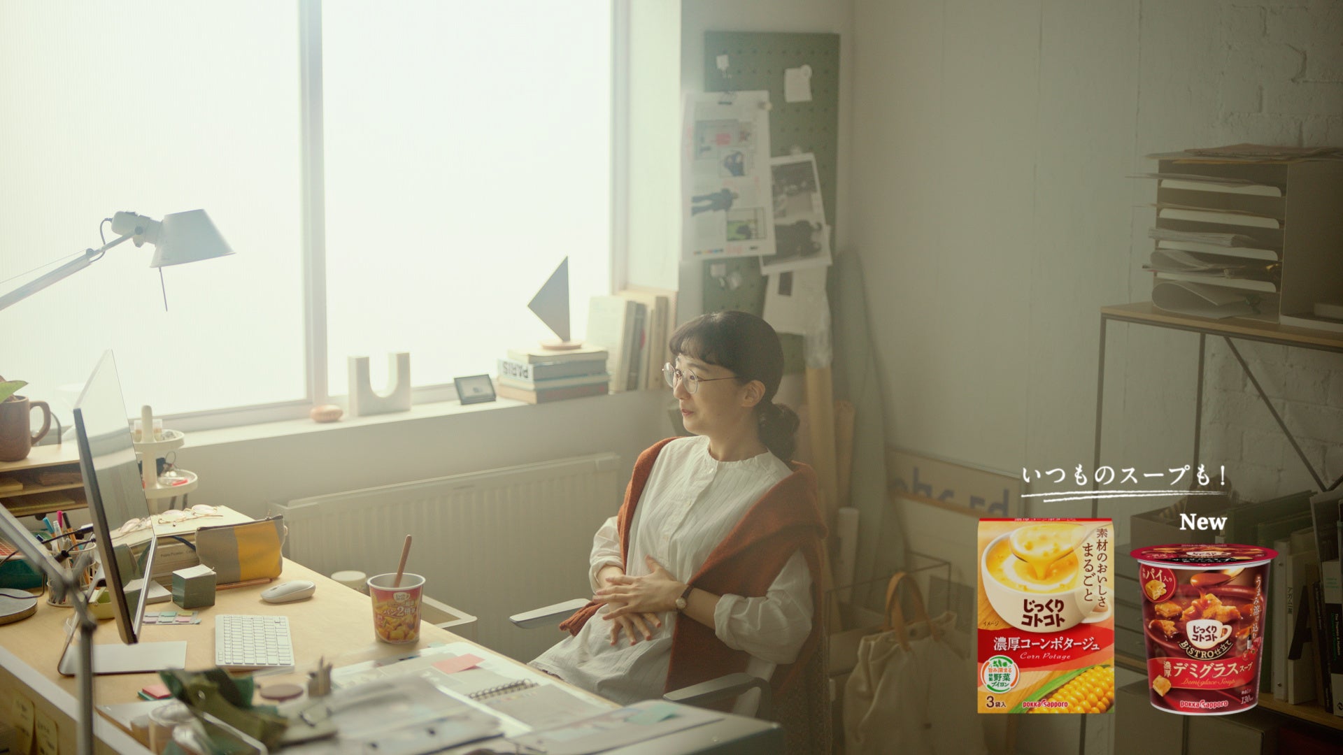 TVCMに登場するのは仕事で忙しい30代女性。慌ただしい生活や仕事の中、サクッと食べられるのに、香ばしくておいしいパンが2倍量入ったカップ入りスープで、こころもおなかも「超まんぞく」になれる。そんな、キーメッセージでもある「超いいコト盛りだくさん」な魅力を表現したTVCMです。