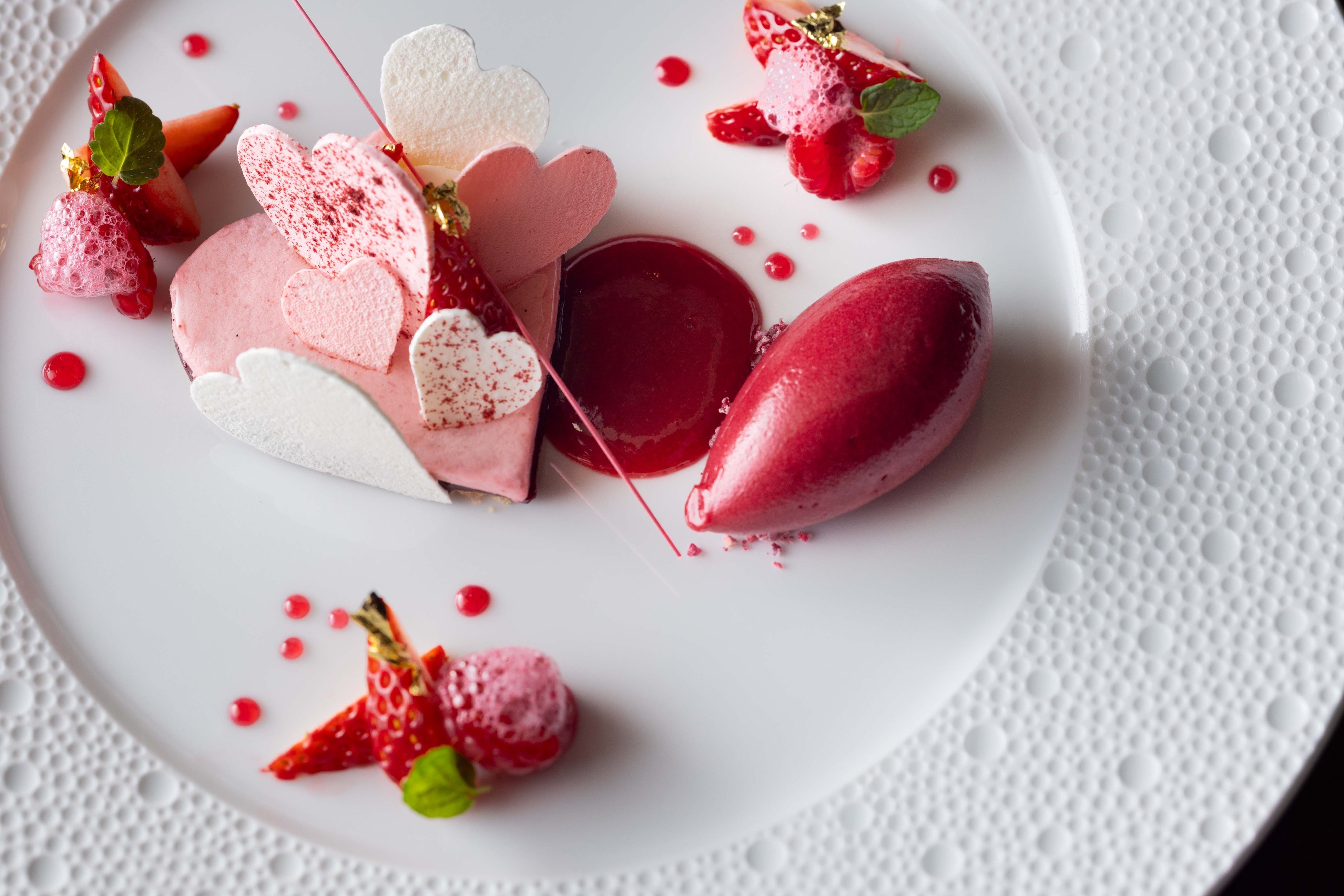 ● デザート「ハートのヴァシュラン 苺と赤い果実のムース マリー・アントワネット ティー香るソースを合わせて」は苺とフランボワーズ、ブラックベリーなど様々なベリーを使った芸術的な一皿です。