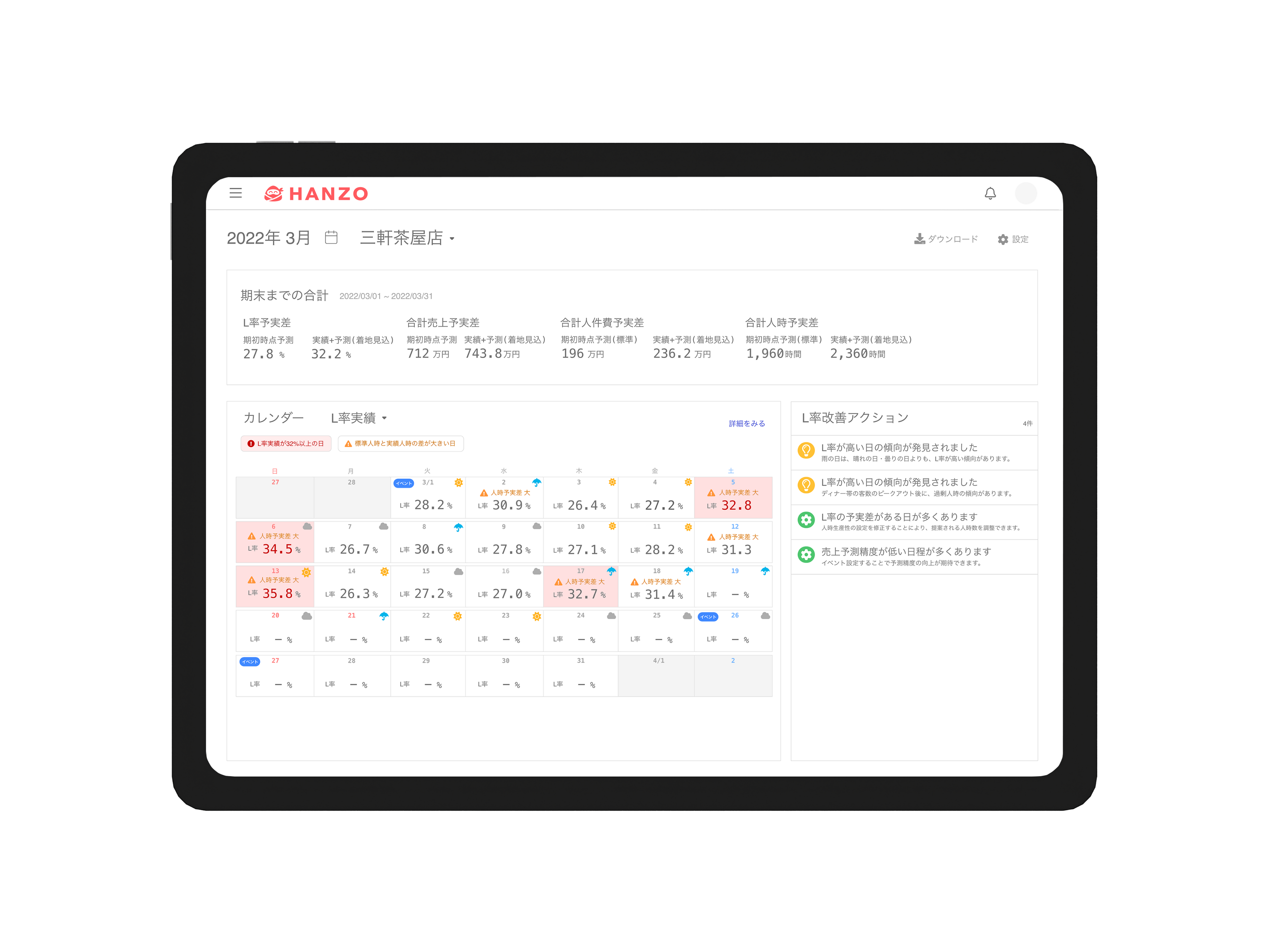 当社が飲食店向けに提供する「HANZO 人件費」は売上と客数の予測や、売上に対する最適な必要人員数の算出をAIが自動で行うため、店舗担当者のスキルや経験に左右されずデータに基づいた最適なシフト作成を可能にします。