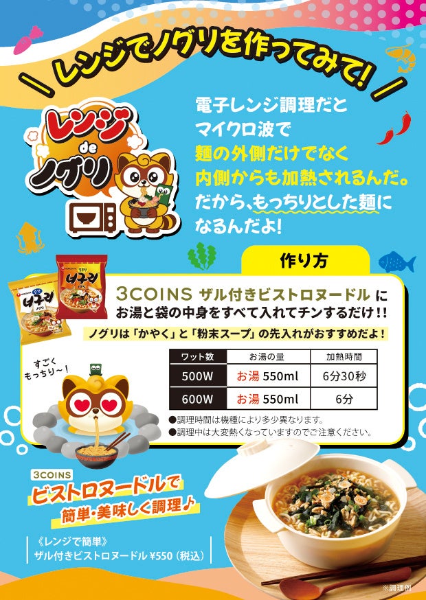 11月4日(火)から3COINS原宿本店及び全国の3COINS+plus 274店舗(イクスピアリ舞浜店除く)でコラボキャンペーンを実施します。電子レンジで簡単に袋麺を調理できる話題の3COINSの「ザル付きビストロヌードル」をご購入いただいた方に、もちもちした太麺が特長の「ノグリラーメン 袋麺」または「ノグリラーメン マイルド 袋麺」のどちらか1袋をプレゼントします。麺が特長のノグリラーメンはレンジで調理することで、より“もっちりした食感”に仕上がるため、ザル付きビストロヌードルとの相性が抜群です。手軽でおいしい「レンジdeノグリ」セットをお得に入手できる期間限定キャンペーンになっています。