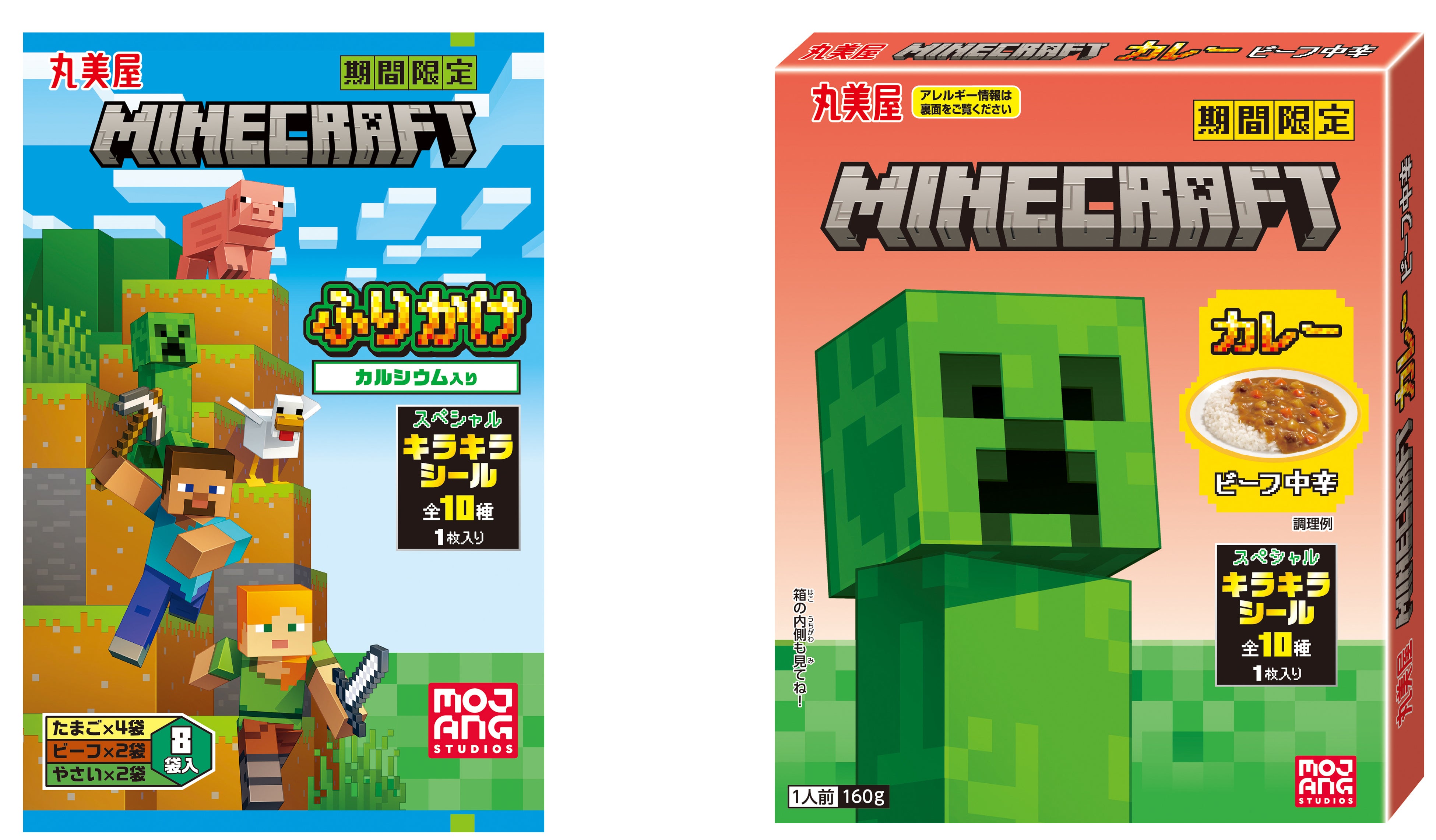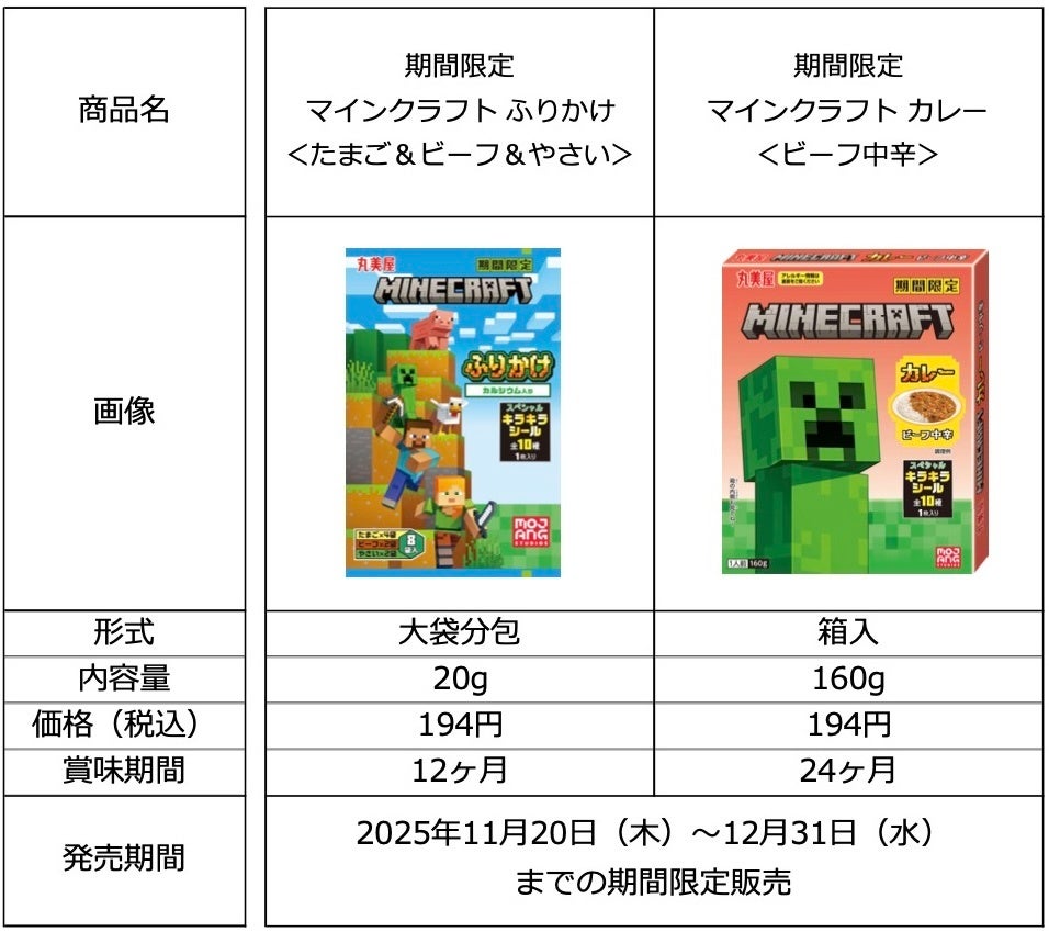 丸美屋⾷品⼯業株式会社(本社︓東京都杉並区、社⻑︓阿部豊太郎)は、世界で最も売れたゲームの一つで、日本でも大人気の「マインクラフト」を採用した「期間限定 マインクラフト ふりかけ<たまご&ビーフ&やさい>」「期間限定 マインクラフト カレー<ビーフ中辛>」を2025年11月20日(木)から12月31日(水)の期間限定で発売いたします。