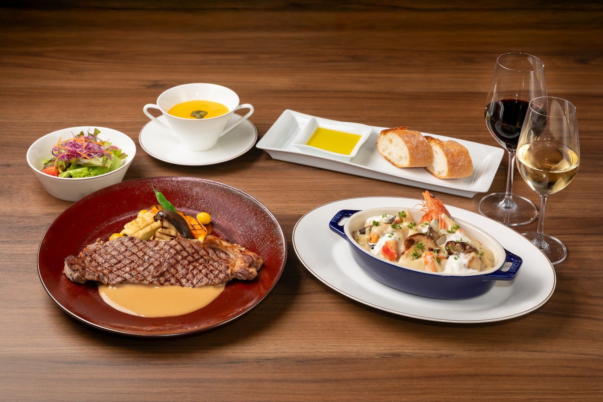 秋の香りを纏う「秋のフェアメニュー」は2種から選んで。秋野菜のグリルと大黒本しめじを添えたサーロインステーキ・クリームソースと、アワビ、タラバ蟹、ホタテ貝など魚介を贅沢に使ったシーフードドリア