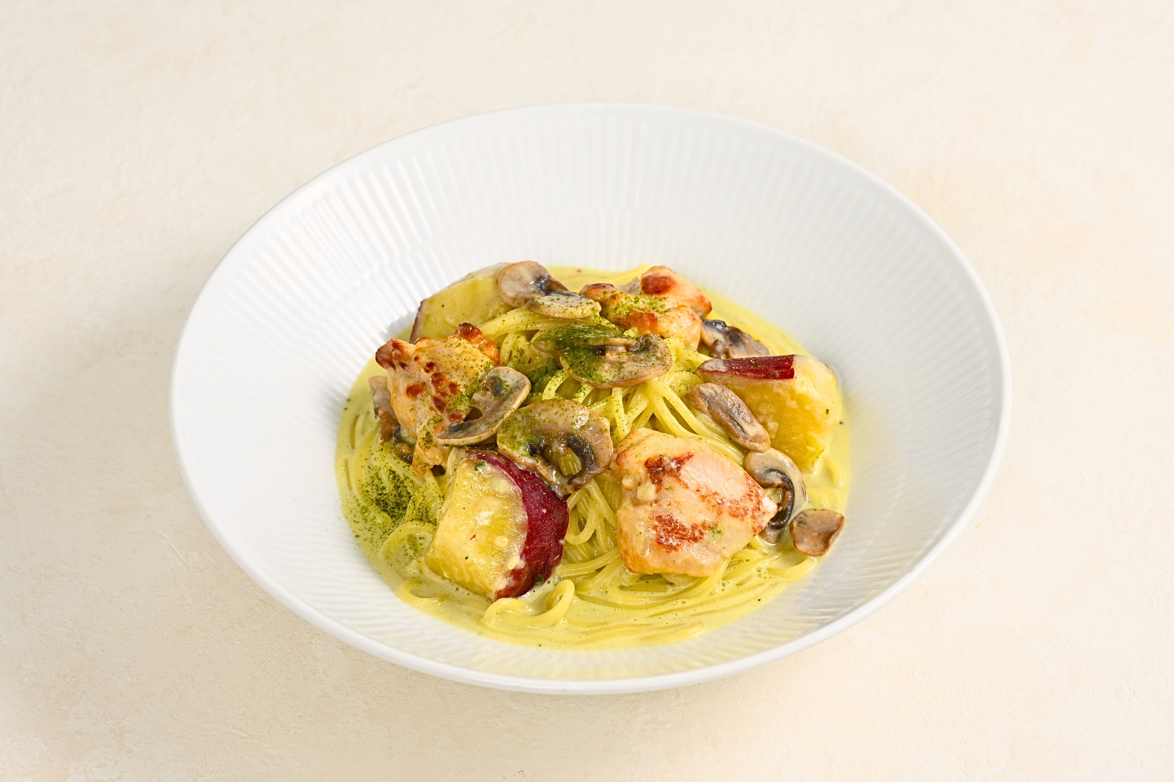 クリームソースやグリルチキン、さつまいも、マッシュルームを組み合わせ、河越茶で香りを引き立てた一品です!