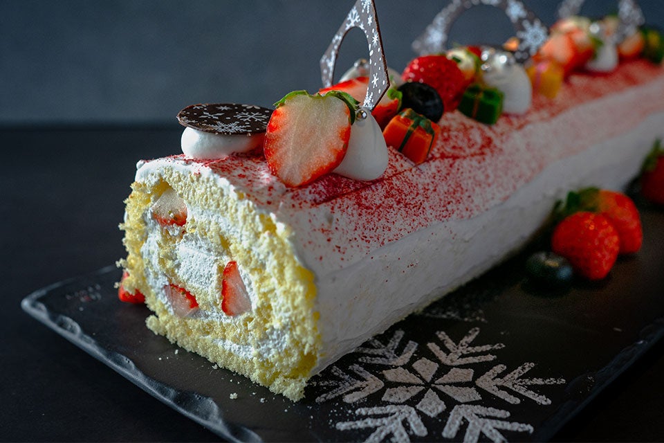 食後には、スタッフがテーブルへお届けするロングブッシュドノエルが登場。目の前で切り分けられる長いケーキは、シェアする楽しさも魅力のひとつです。加えて、ホテルパティシエによる季節のスイーツも食べ放題で。甘く、華やかに、クリスマスの余韻を締めくくります。