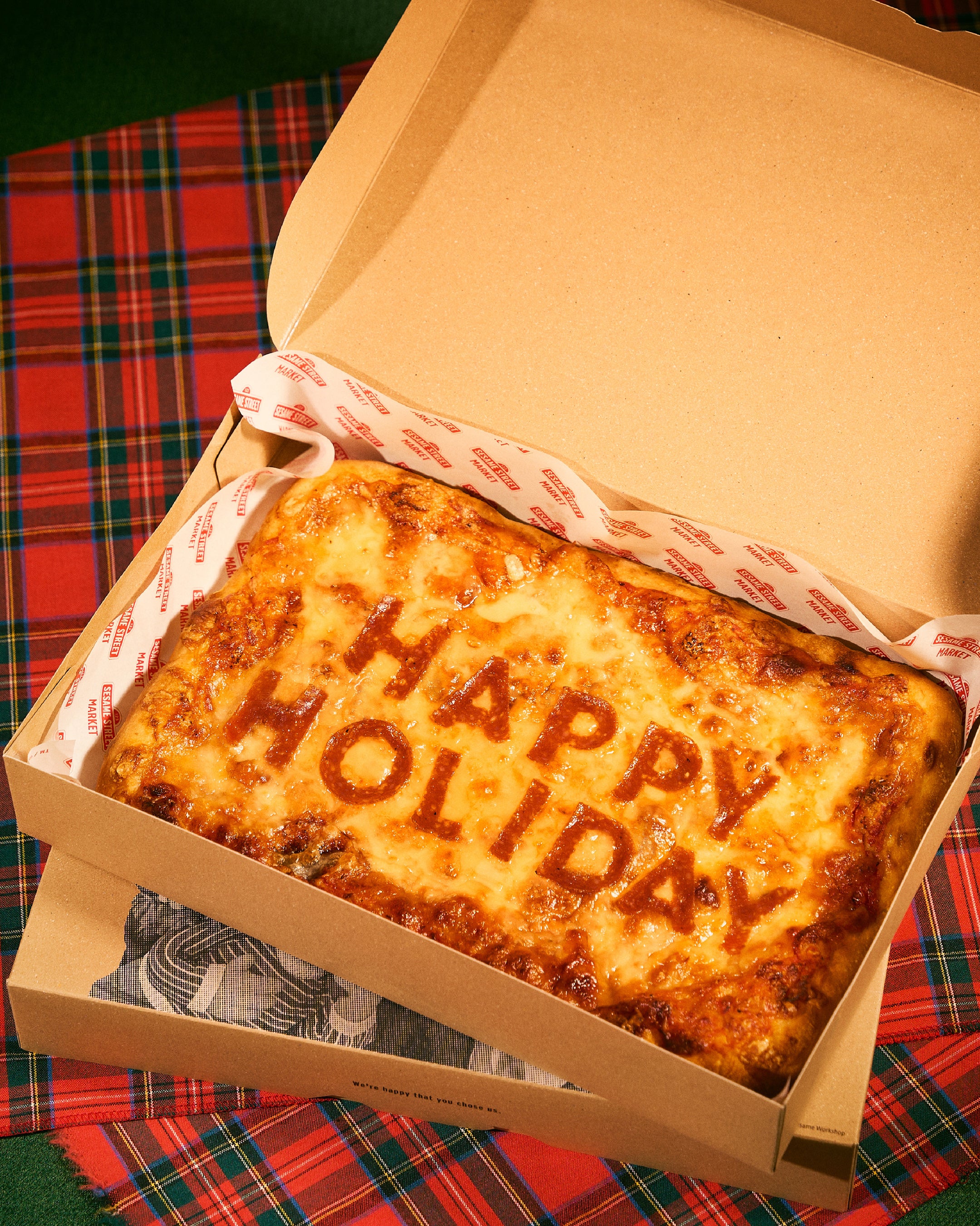 セサミストリートマーケットのカフェで大人気のアメリカンピザを、ホリデーシーズン限定のスペシャル仕様でご用意しました。“HAPPY HOLIDAYS”のメッセージと、セサミストリートの仲間たちをデザインしたボックスに詰めた、特別感あふれるテイクアウト限定ピザボックスです。サクッと香ばしい生地に、とろけるチーズがたっぷりと広がる満足感のある味わいで、2~3名で楽しめるサイズ感も魅力。