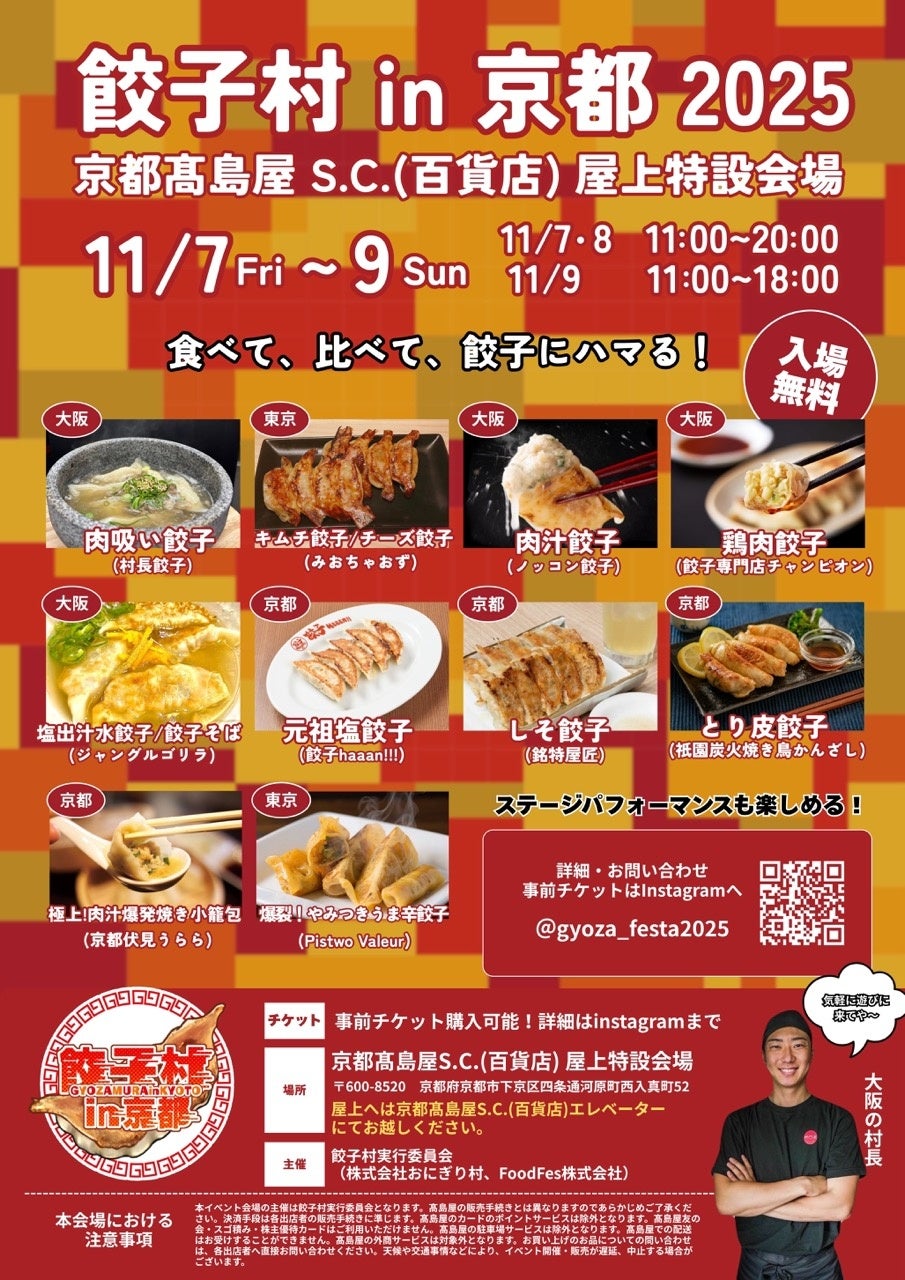 株式会社おにぎり村(代表取締役:池尾俊哉)とFoodFes株式会社(代表取締役:稲垣一馬)は2025年11月7日(金),8日(土),9日(日)の3日間、京都高島屋S.C. (百貨店)屋上特設会場にて「餃子村 in 京都」を開催いたします。