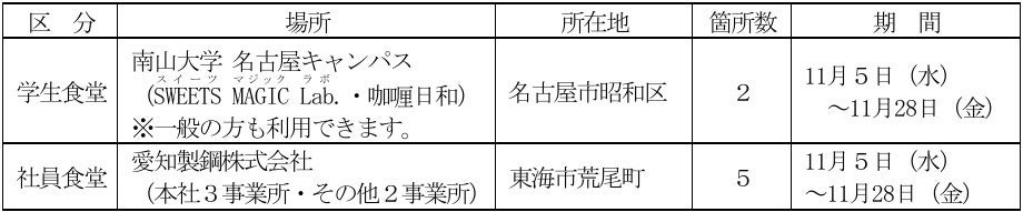 愛知県では、消費者と生産者が一緒になって愛知の農林水産業を支える「いいともあいち運動」を推進しています。この取組の一環として、県民の皆様に地産地消を一層進めていただくため、御賛同いただいた南山大学の学生食堂や愛知製鋼株式会社の社員食堂において、県産農林水産物を使用した料理を提供するメニューフェアを開催します。