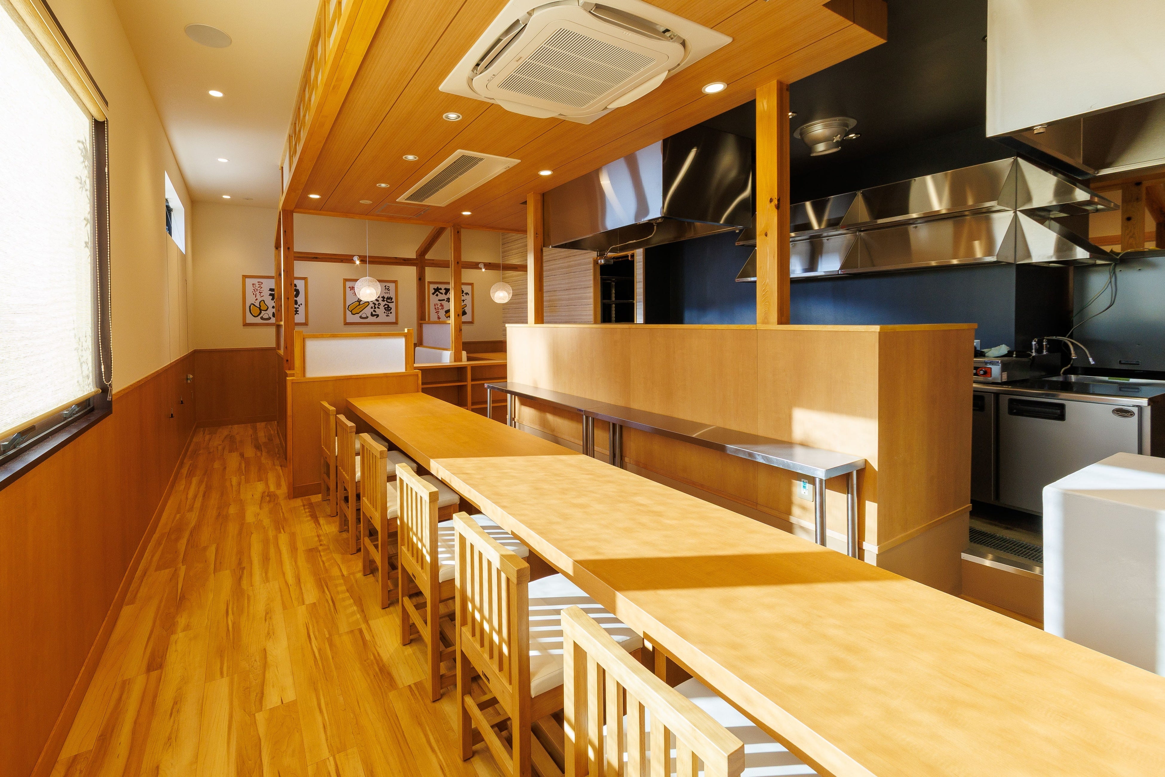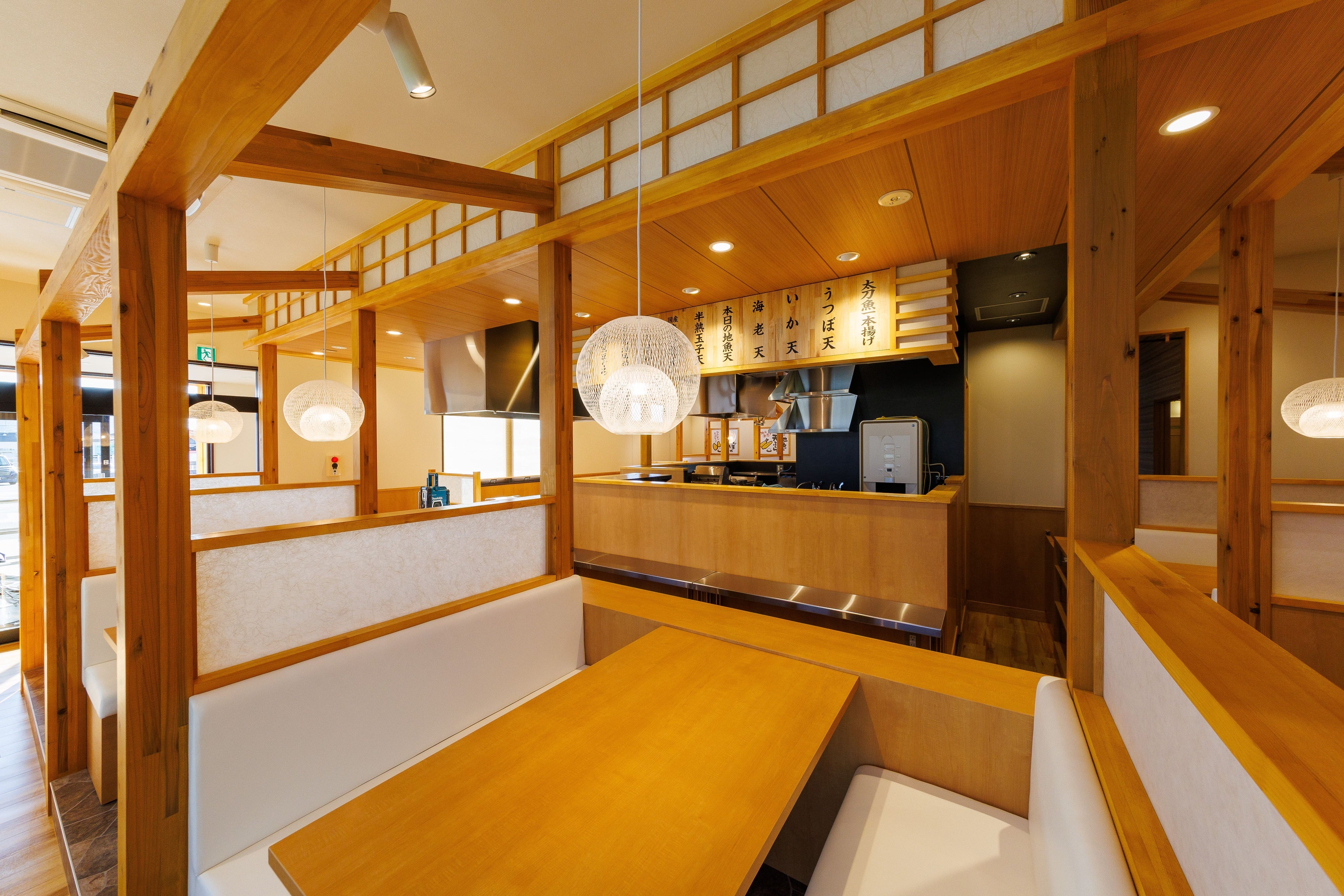 同系列店「厚切りとんかつ よし平 岩出中迫店」の隣に位置する当店は、敷地内に駐車場を完備しております。店内に入るとすぐ目の前には大きなかまどがお出迎え。落ち着いた雰囲気と開放感のある客席には、カウンター席のほか、ゆったりとお過ごしいただけるボックス席もご用意しております。また、すべての席が調理場と隣接しており、ご注文をいただいてから、職人が一つひとつ丁寧に揚げた天ぷらを提供いたします。おひとりさま、ご友人、ご家族など、老若男女問わず幅広いシーンでご利用ください。