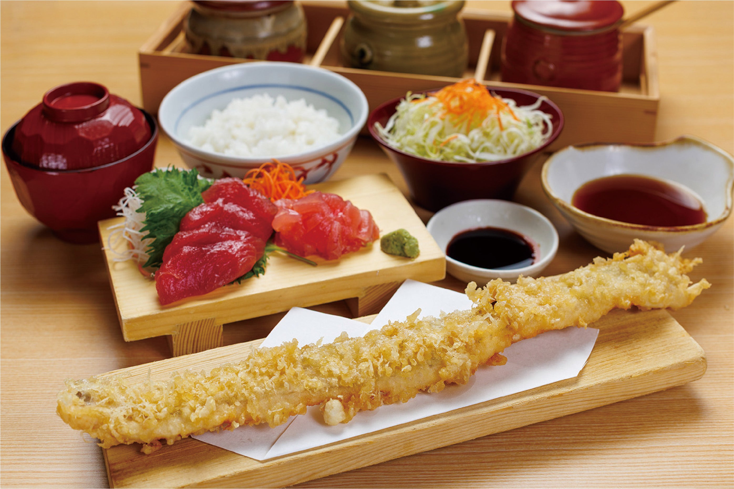 新鮮な太刀魚を、約40cmの迫力満点な一本天ぷらに。ふっくらとした身が特長で、白身ならではの “柔らかくジューシー” な食感と “衣のサクッ” とした2つの食感をお楽しみいただけます。さらに、生まぐろの刺身も贅沢に盛り付けた、天ぷらと刺身を心ゆくまでお楽しみいただけるメニューに仕上げました。