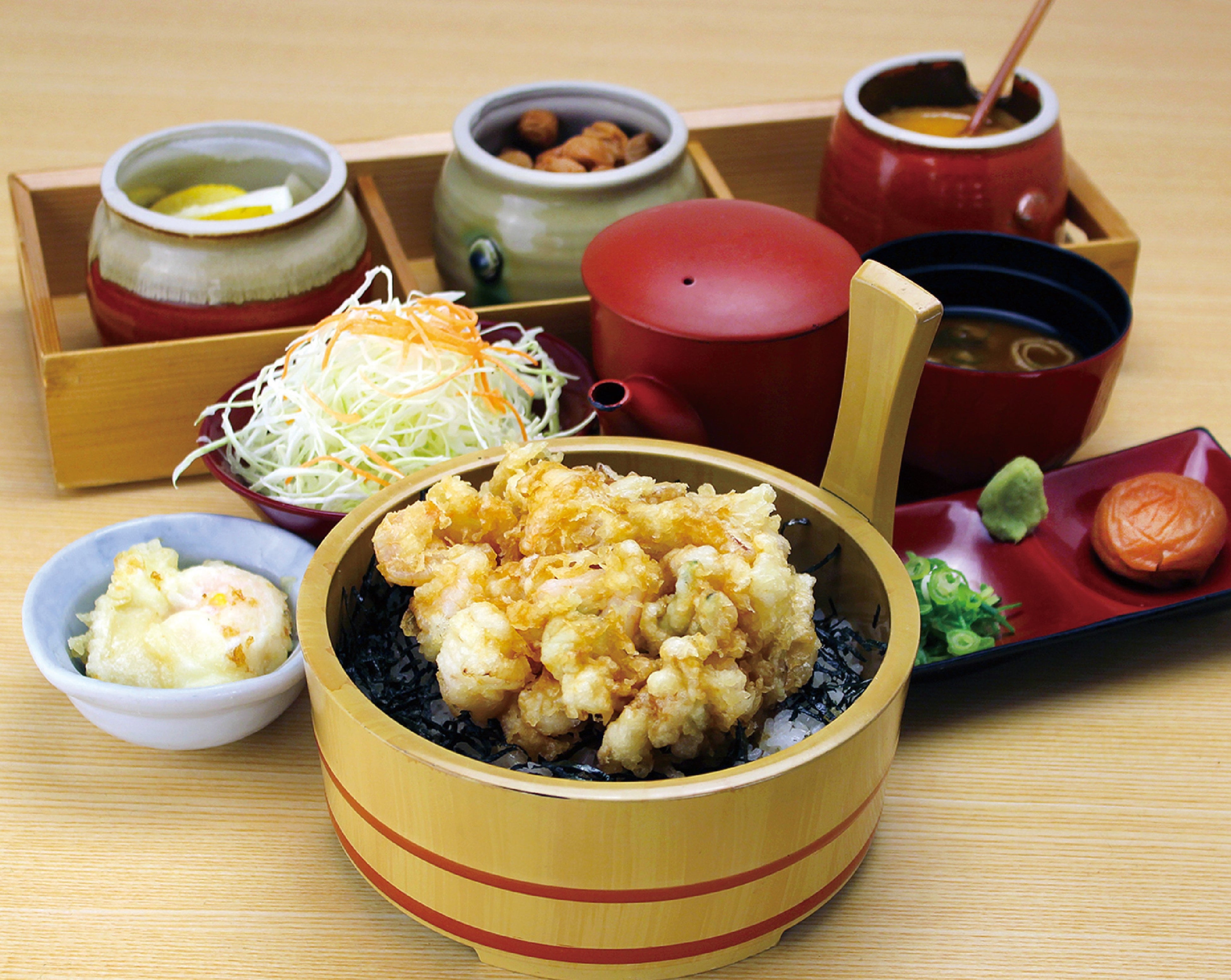 『海老天ひつまぶし御膳』 は、海老のかき揚げをひつまぶし風にアレンジした、よし平自慢のオリジナルメニュー。まずは、天丼としてそのまま味わい、次に薬味と半熟玉子天を混ぜて味の変化をお楽しみください。仕上げは、紀州南高梅とわさびを添えて出汁を注ぐ “天丼茶漬け” に。3段階の食べ方でお楽しみいただけます。