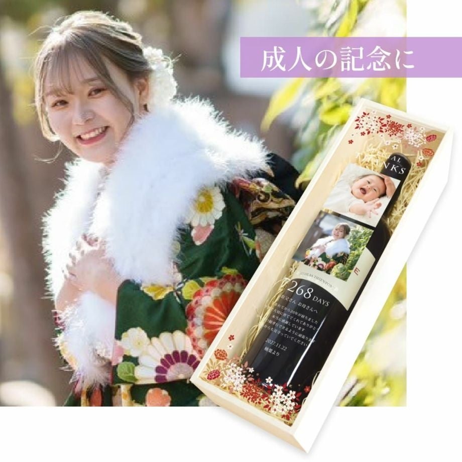 「子育て感謝状ワイン」は、木箱にワインとともに、写真・カウント日数・メッセージを印刷するオーダーメイド仕様。用途も結婚式、成人式、卒業・入学など、さまざまな「節目」に対応しており、