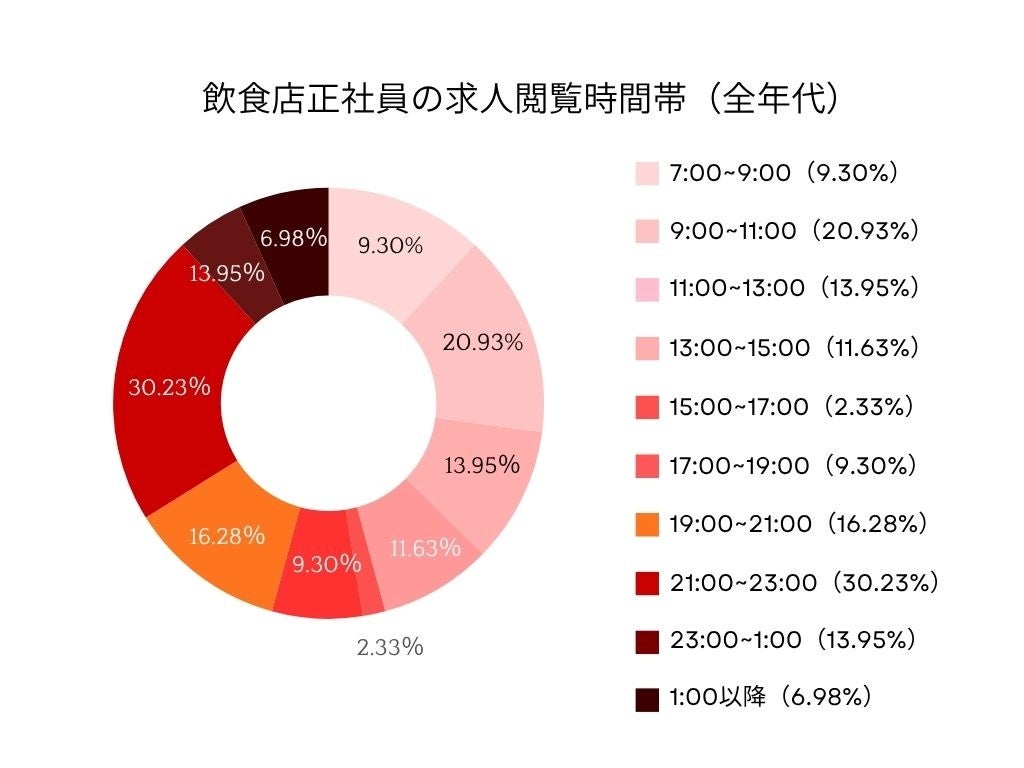 全年代における、飲食店正社員求人の閲覧時間帯トレンドでは、21:00~23:00が最も多く(30.23%)、次点で9:00~11:00が多い(20.93%)という結果になりました。